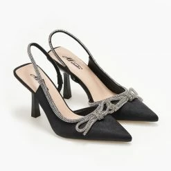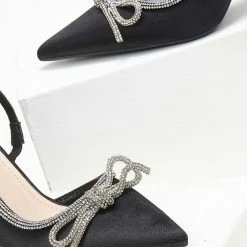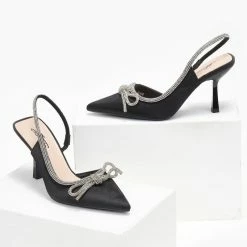 Γόβες σατέν μυτερές με λεπτό τακούνι. Έχουν σχέδιο strass φιόγκο. Το λουράκι έχει λάστιχο στην εσωτερική του πλευρά για καλύτερη εφαρμογή.