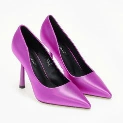 Γόβες σατέν σε μυτερή φόρμα. Έχουν λεπτό γυαλιστερό τακούνι.
