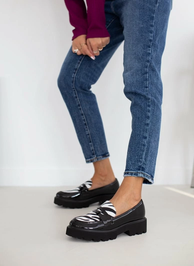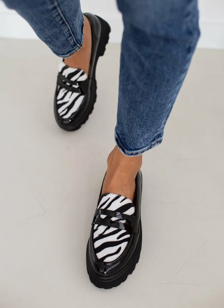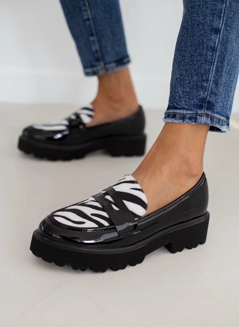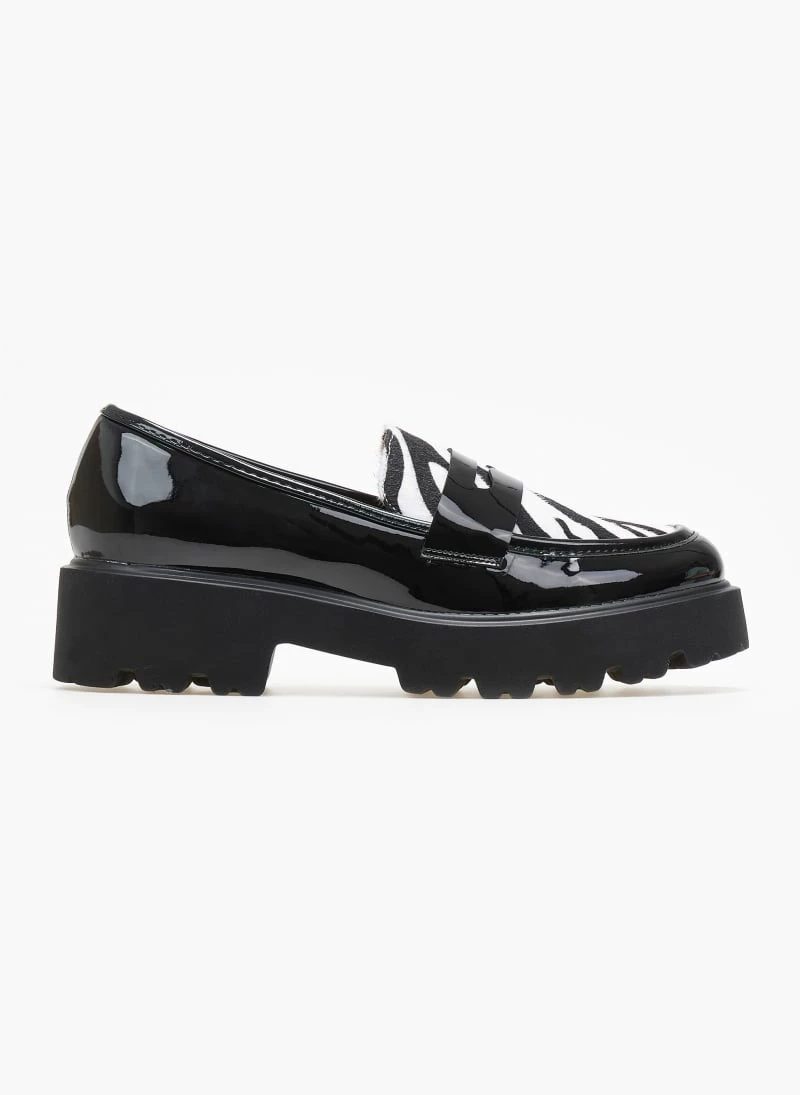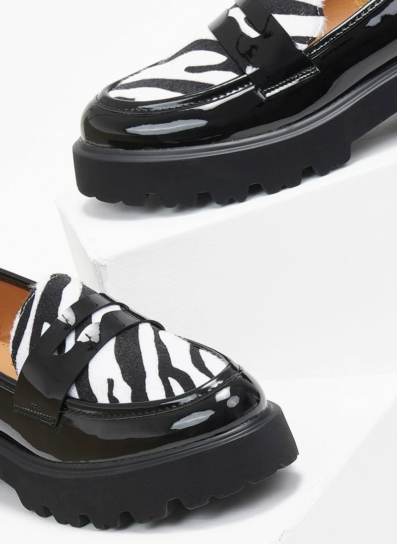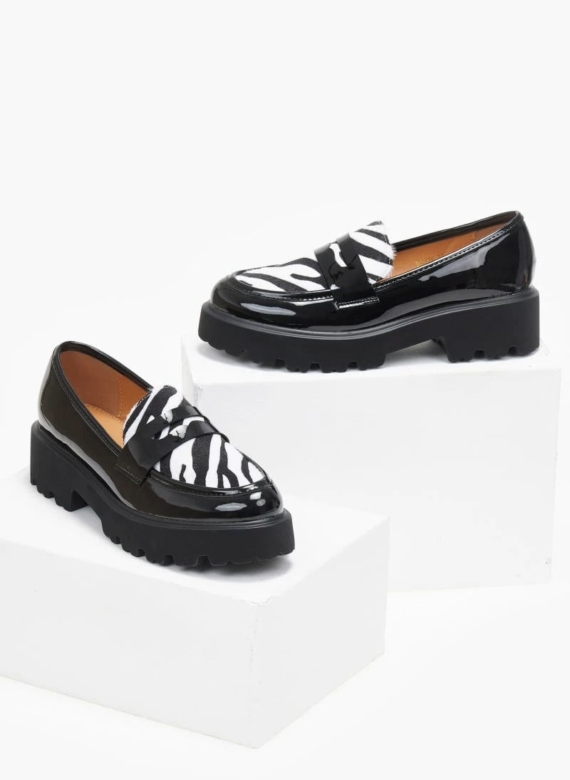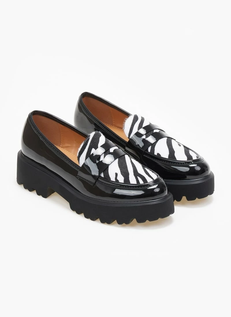 Loafers λουστρίνι με animal print λεπτομέρεια. Έχουν chunky τρακτερωτή σόλα.