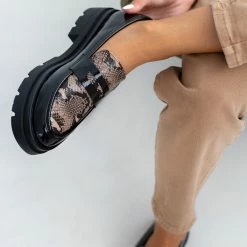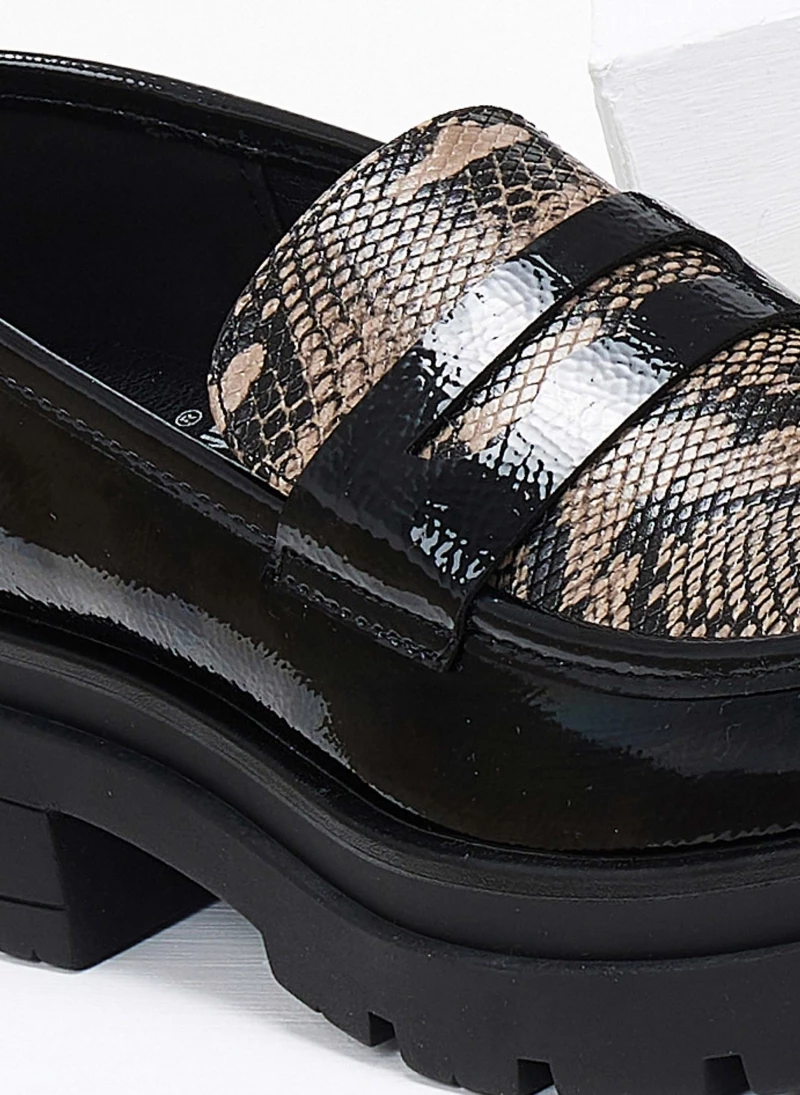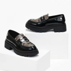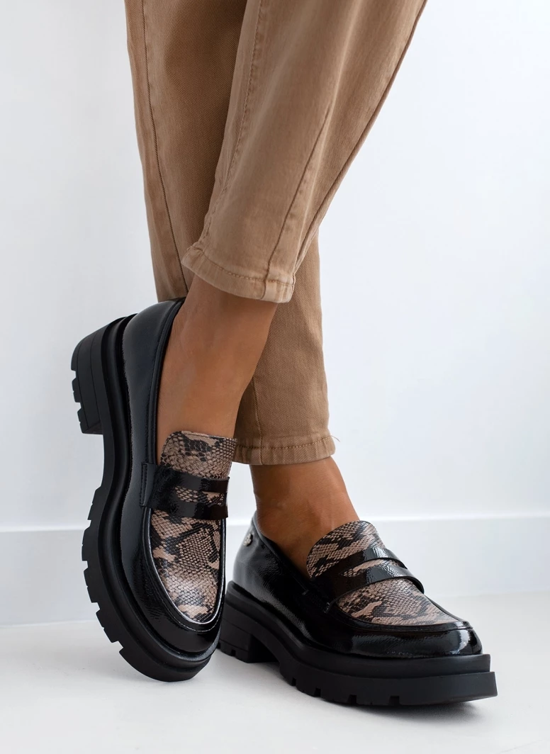 Oxfords λουστρίνι Xti. Έχουν λεπτομέρεια animal print. Τρακτερωτή σόλα. Vegan approved.