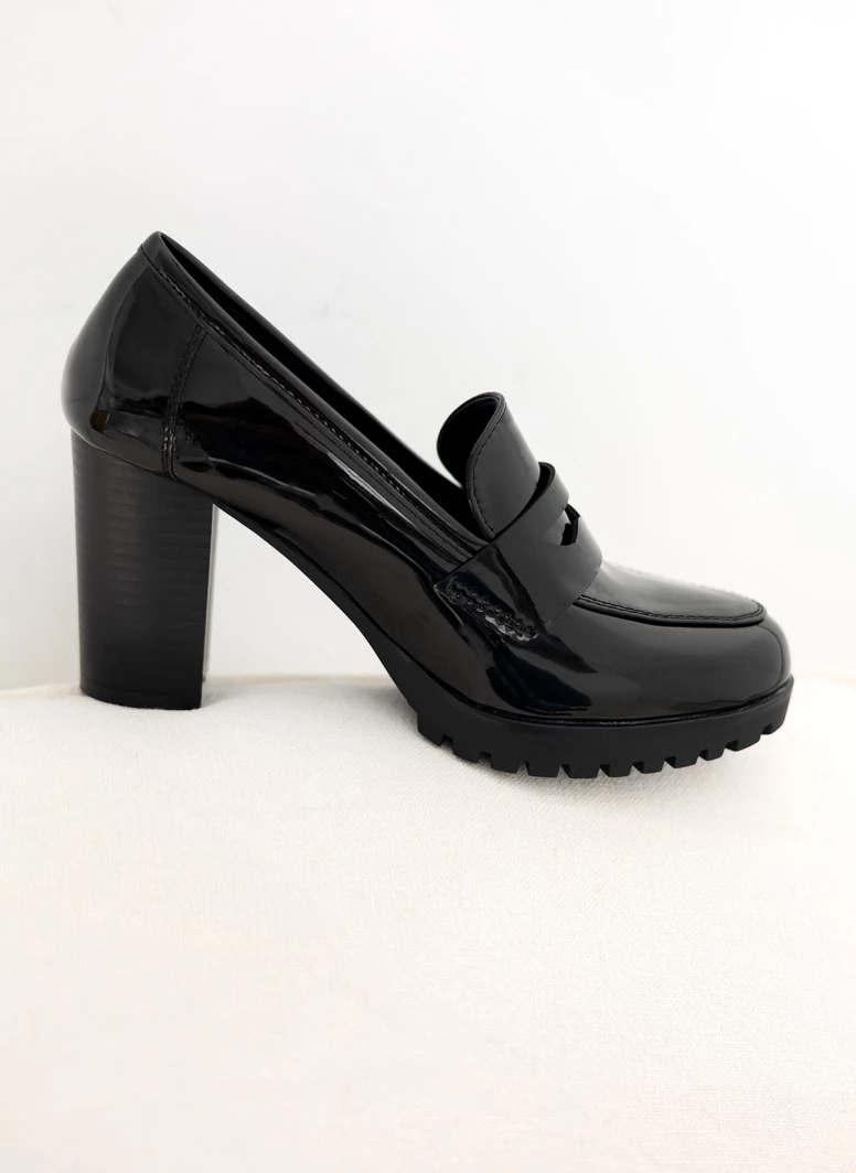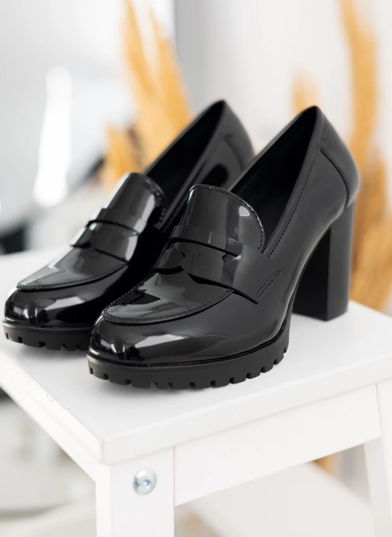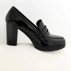 Loafers λουστρίνιο με ψηλό τακούνι. Έχουν τρακτερωτή σόλα. Εξωτερική ραφή στο επάνω μέρος.