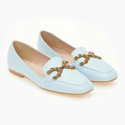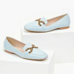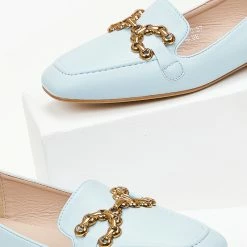 Loafers σε καρέ γραμμή. Έχουν μεταλλικό διακοσμητικό και εξωτερική ραφή στη μπροστινή πλευρά.