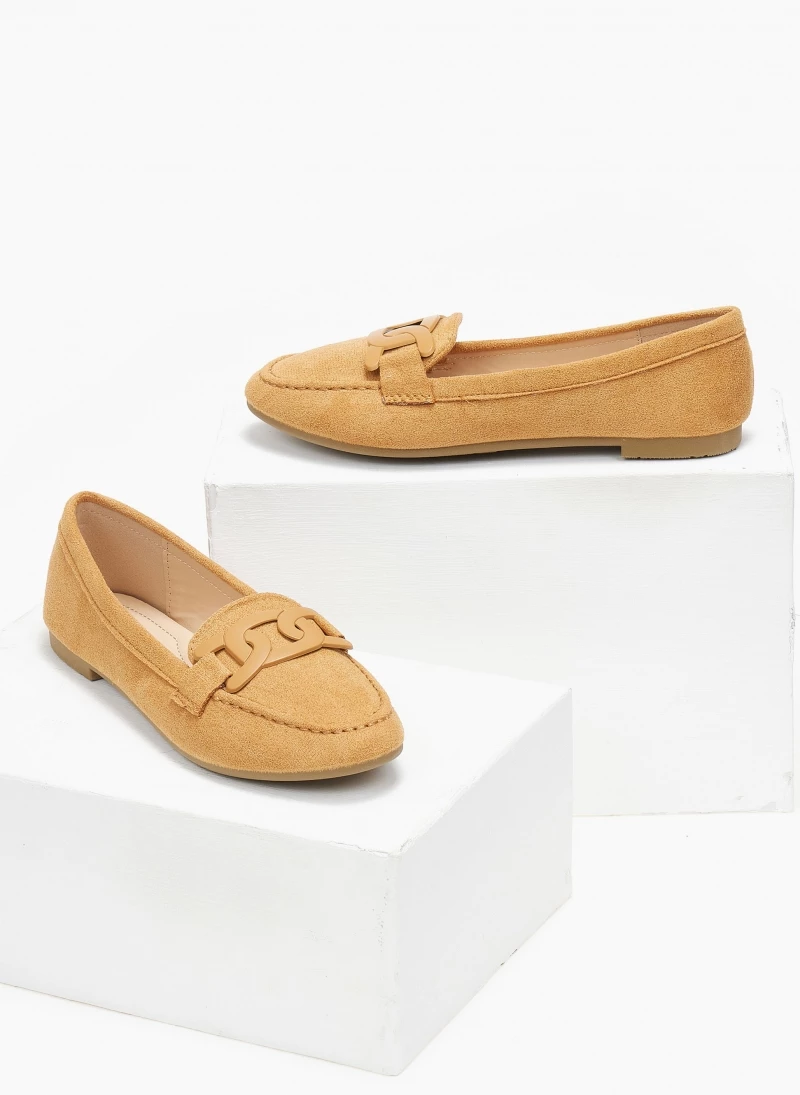 Loafers suede με μεταλλικό διακοσμητικό στο ίδιο χρώμα. Μαλακή σόλα από λάστιχο. Στρογγυλή γραμμή.