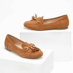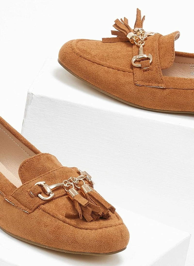Basic suede loafers με εξωτερική ραφή. Έχουν μεταλλική αγκράφα στο κουτεπιέ με φουντάκια .Μαλακή σόλα.
