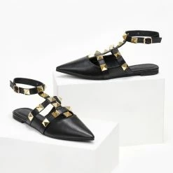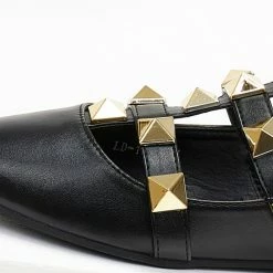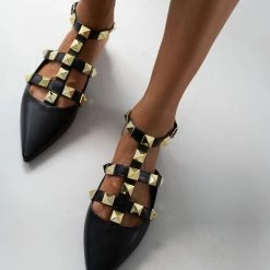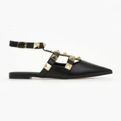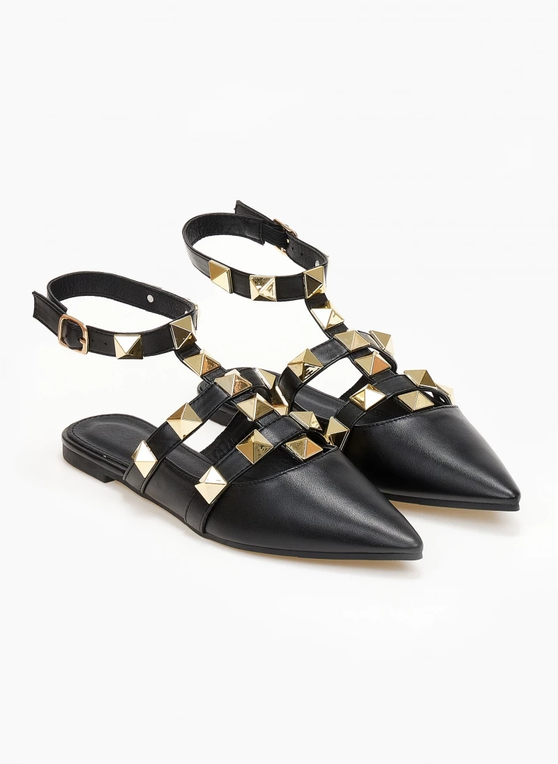 Μυτερές ανοιχτές μπαλαρίνες με μεταλλικά τρουκς. Δένουν με μπαρέτα στο ύψος του αστραγάλου.