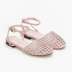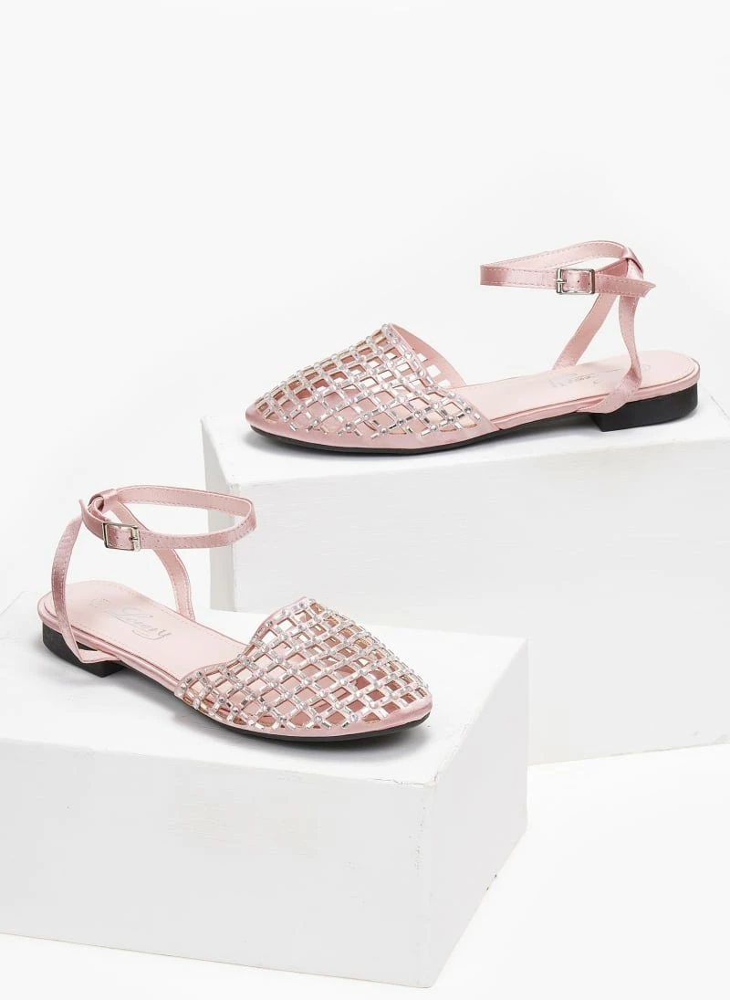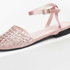 Flat μπαλαρίνες με διάτρητο σχέδιο. Το πάνω μέρος είναι με στρας. Δένουν με λουράκι στο ύψος του αστραγάλου. Στρογγυλή γραμμή.
