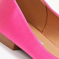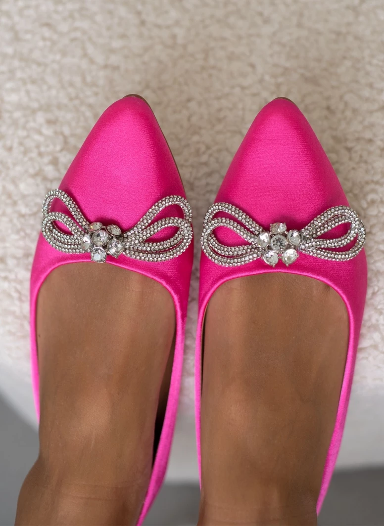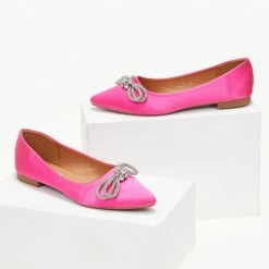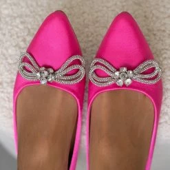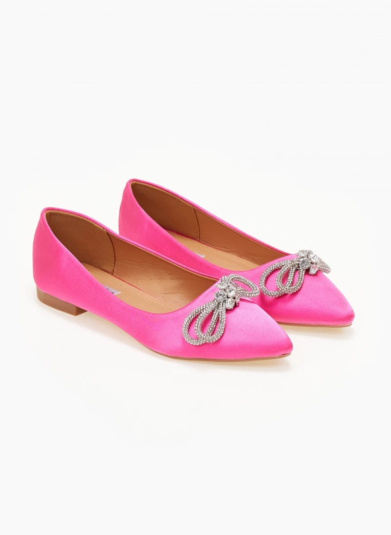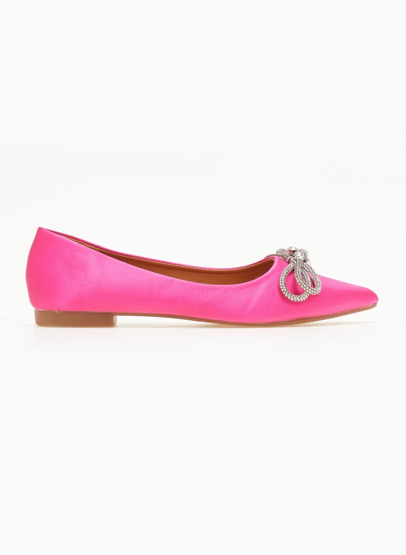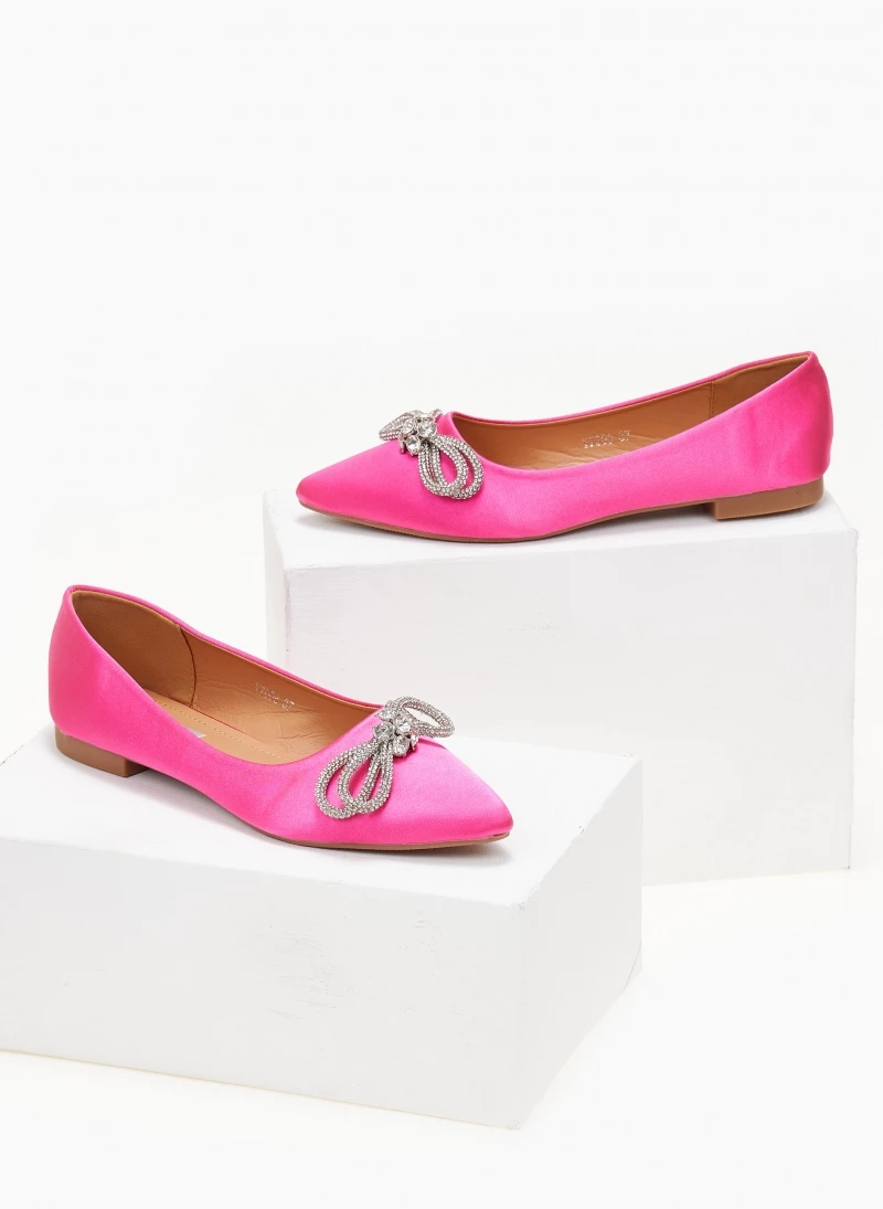 Μπαλαρίνες μυτερές σατέν χωρίς τακούνι. Έχουν strass φιογκάκι. Μαλακή σόλα από λάστιχο.