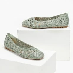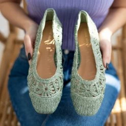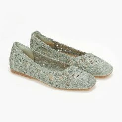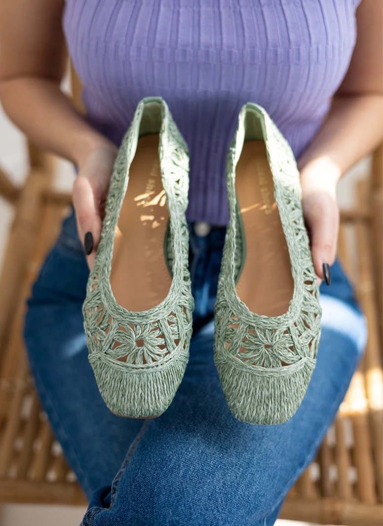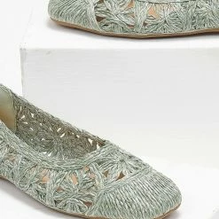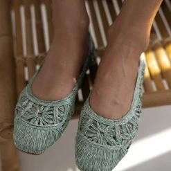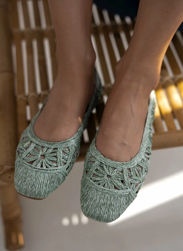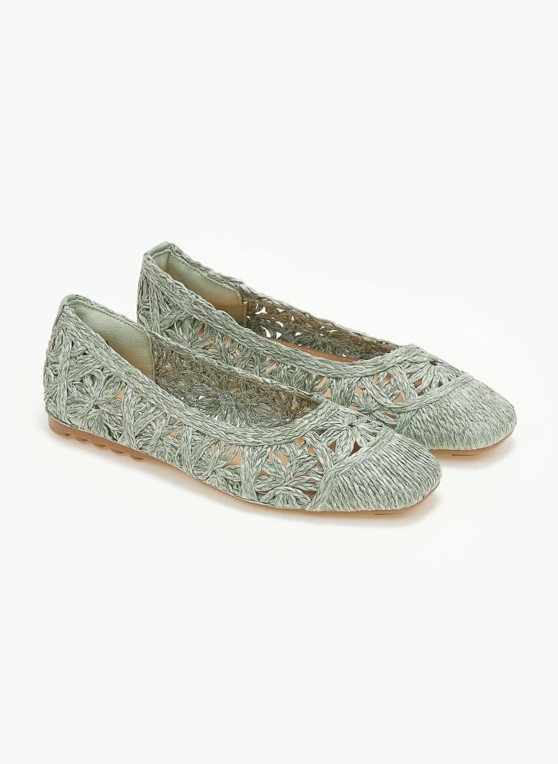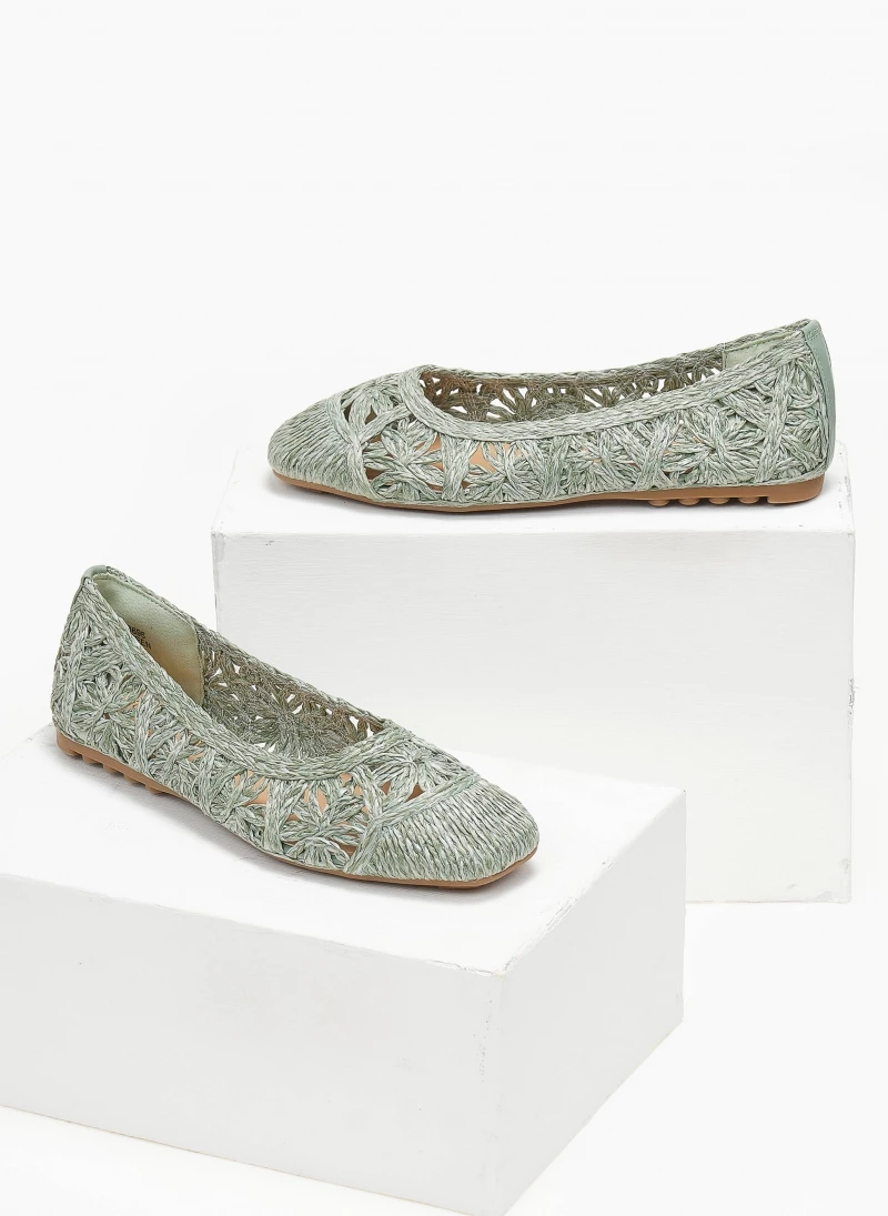 Μπαλαρίνες από ψάθα με πλεκτό σχέδιο. Καρέ γραμμή. Σόλα από λάστιχο