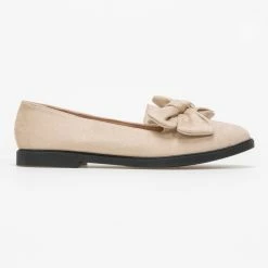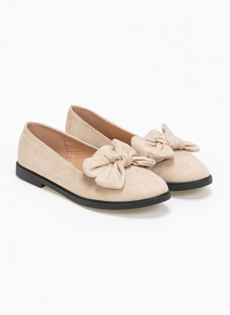 Suede μπαλαρίνες σε στρογγυλή γραμμή.Έχουν φιόγκο στο επάνω μέρος.Η σόλα είναι μαλακή από λάστιχο.