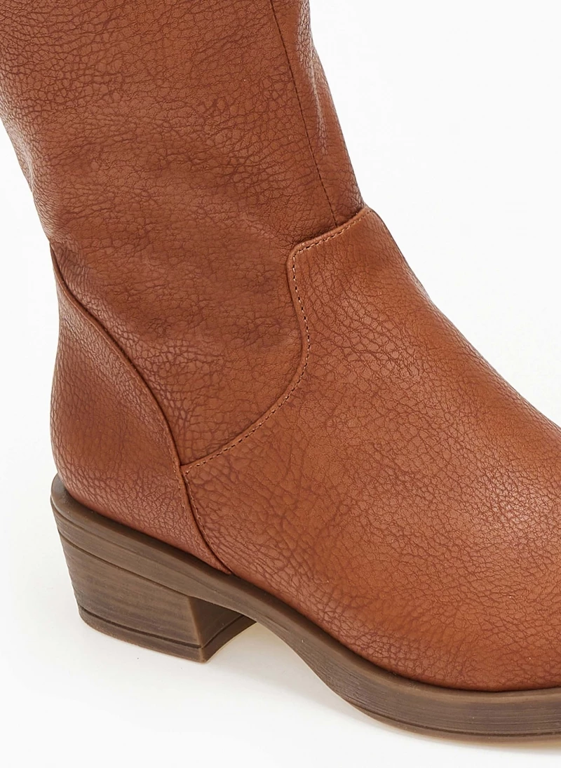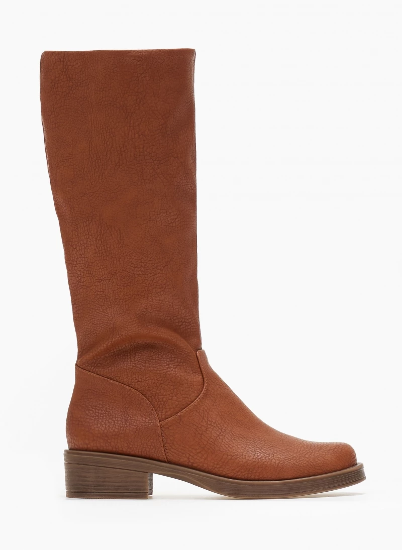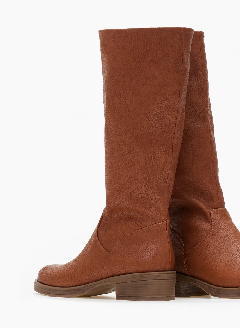 Μπότες φλατ σε στρογγυλή γραμμή. Φτάνουν στη μέση της γάμπας. Φερμουάρ στην εσωτερική τους πλευρά. Ελληνικής κατασκευής.