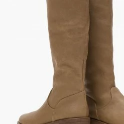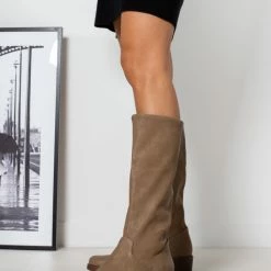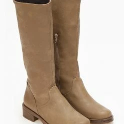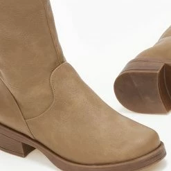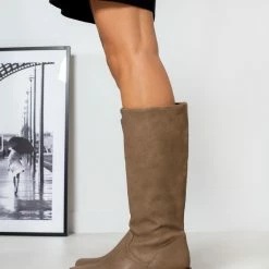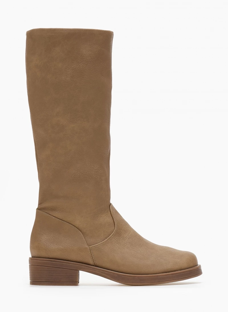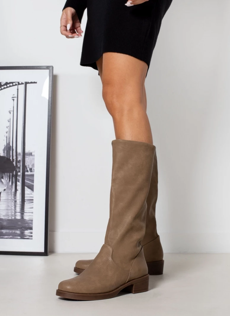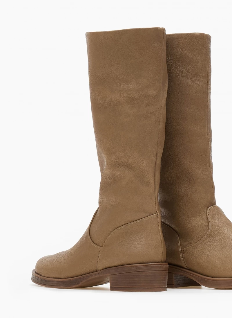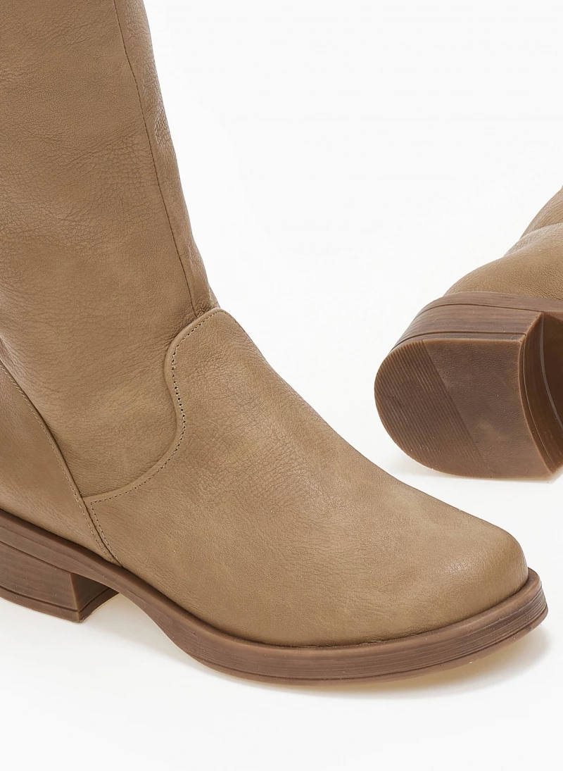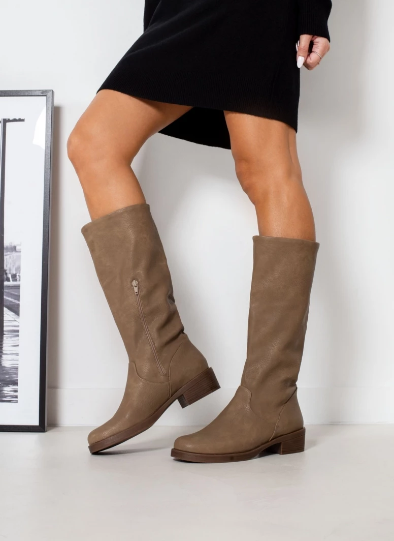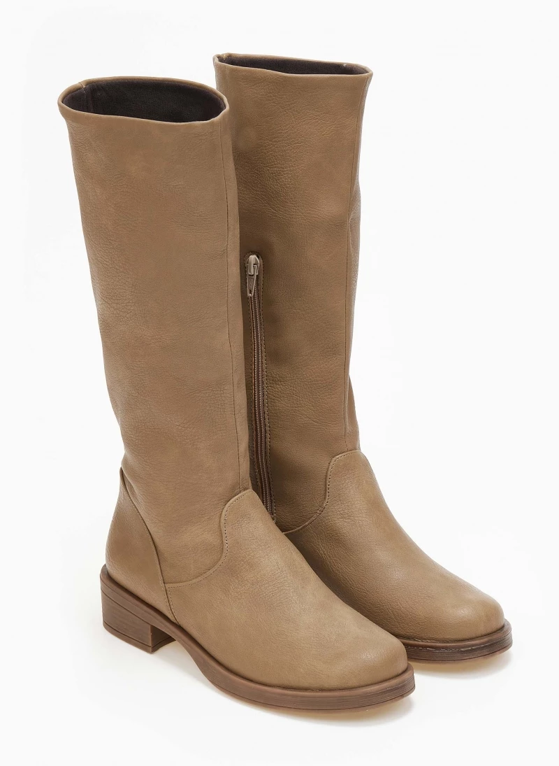 Μπότες φλατ σε στρογγυλή γραμμή. Φτάνουν στη μέση της γάμπας. Φερμουάρ στην εσωτερική τους πλευρά. Ελληνικής κατασκευής.