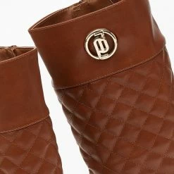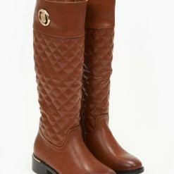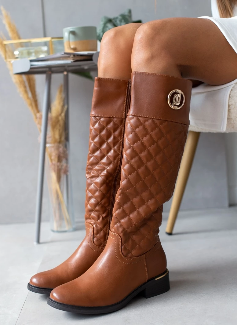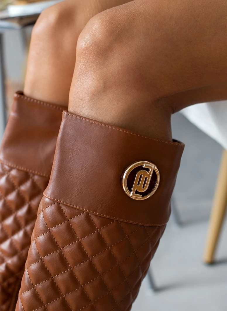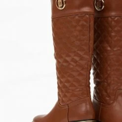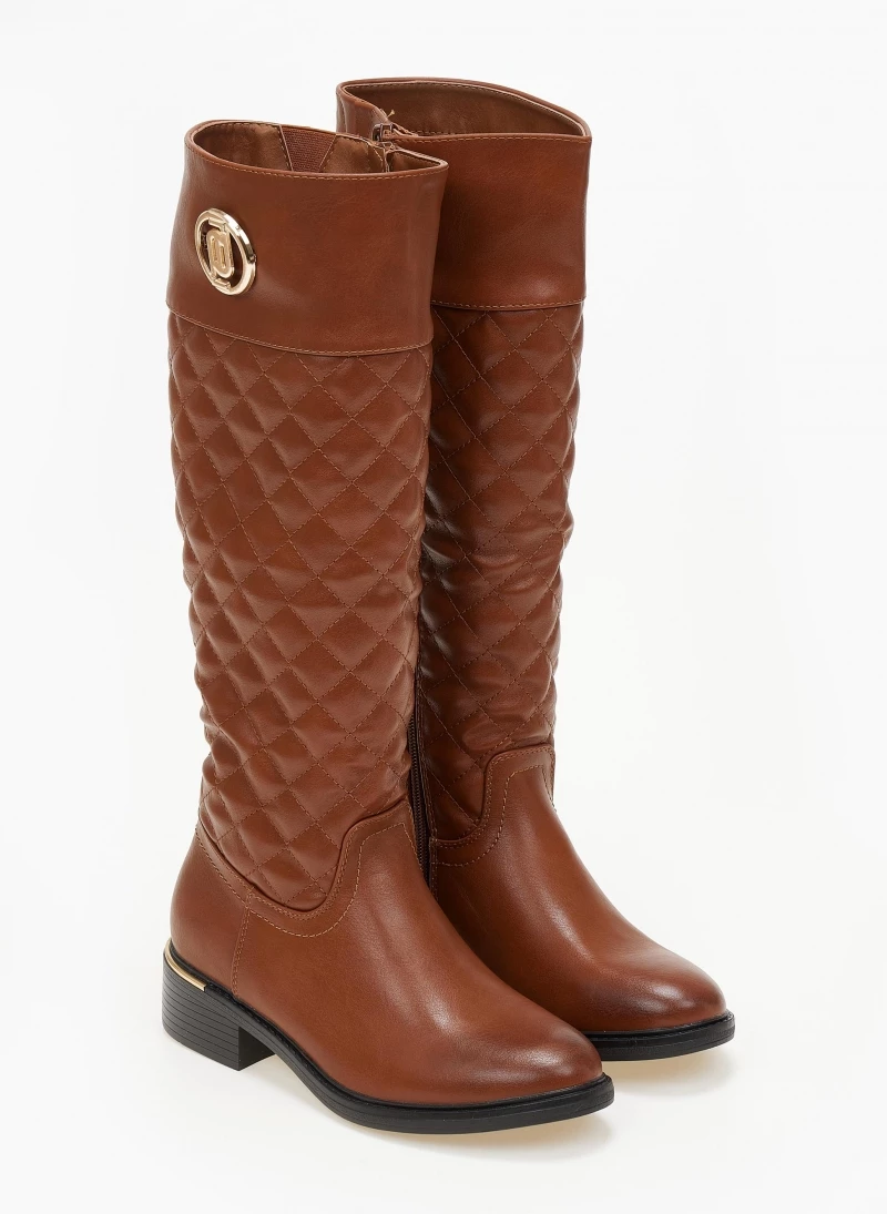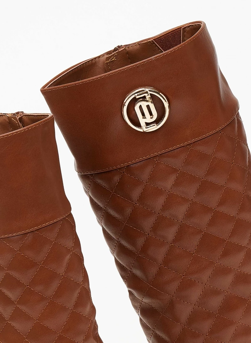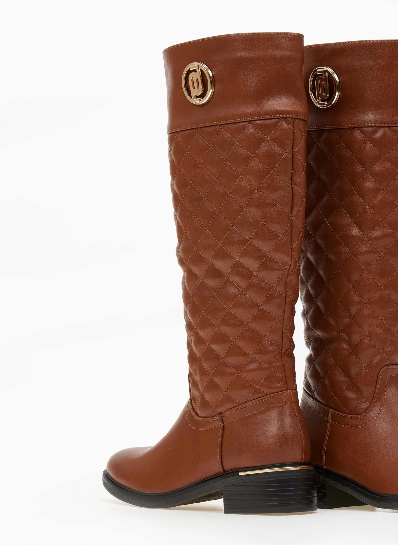Μπότες ιππασίας καπιτονέ. Έχουν μεταλλικό διακοσμητικό στο επάνω μέρος. Διακριτική μεταλλική λεπτομέρεια στη σόλα. Μικρό άνοιγμα με λάστιχο στην εσωτερική τους πλευρά. Στρογγυλή γραμμή.