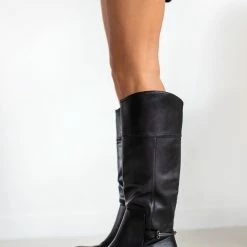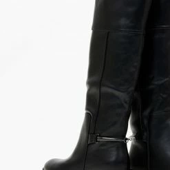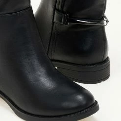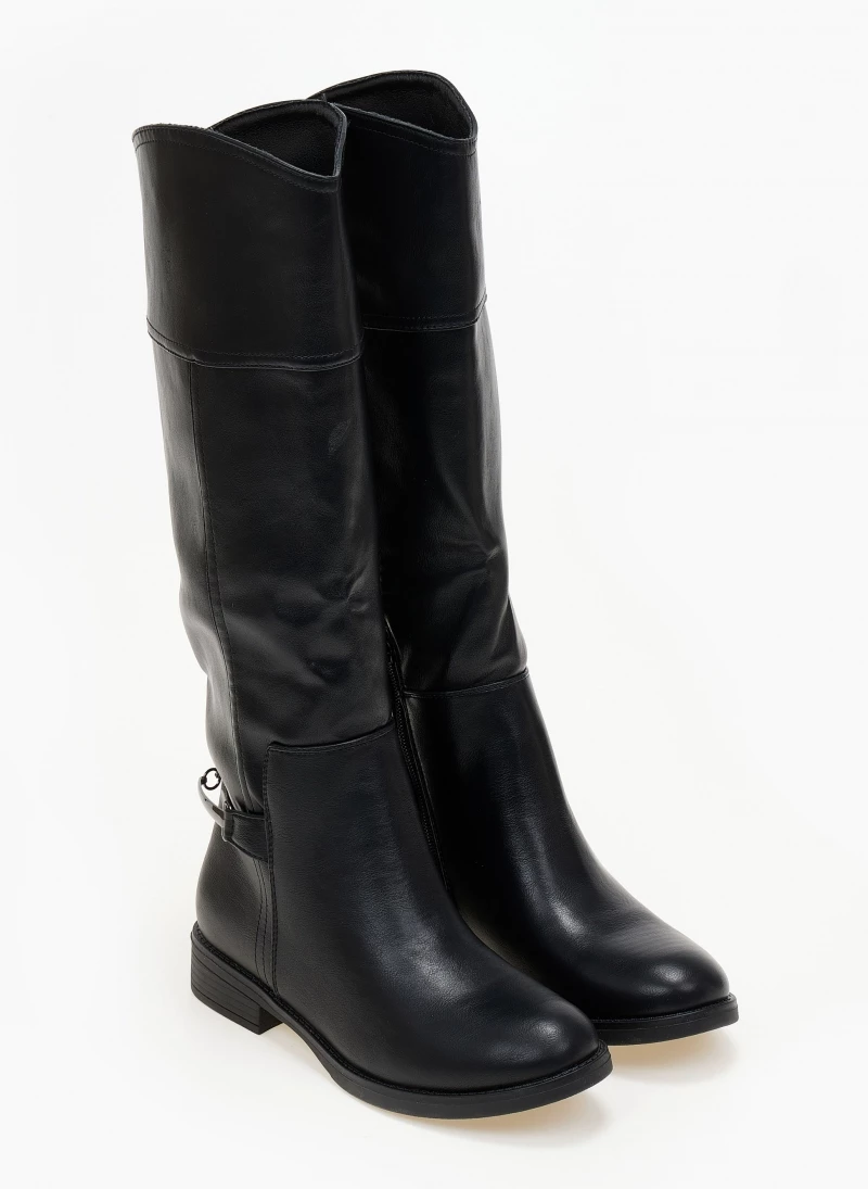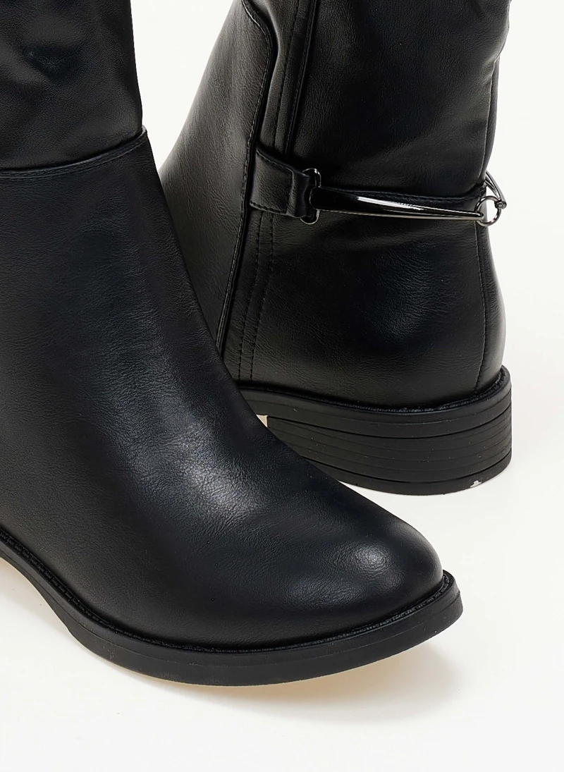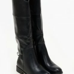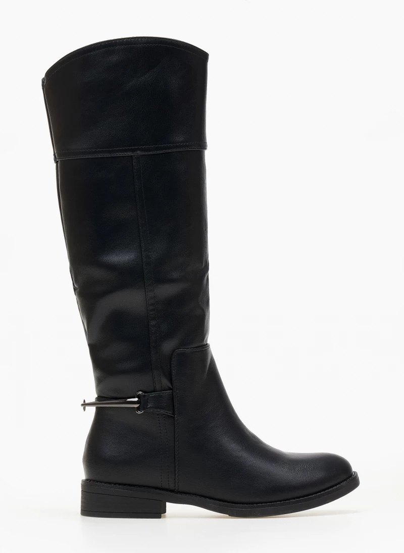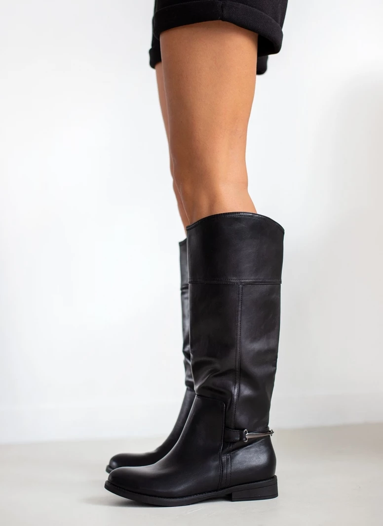Μπότες φλατ με μεταλλικό διακοσμητικό στο πίσω μέρος. Διαθέτουν μικρό φερμουάρ στην εσωτερική τους πλευρά. Έχουν εφέ εξωτερικές ραφές. Στρογγυλή γραμμή.