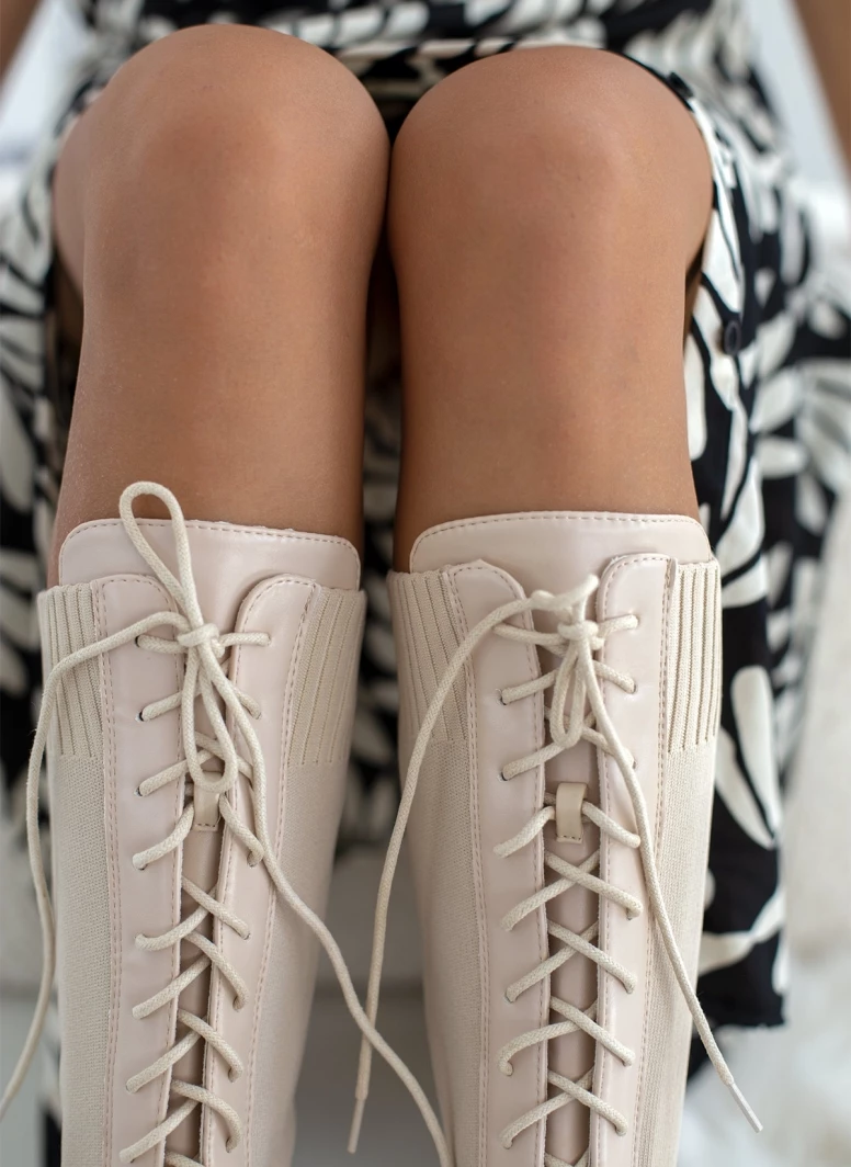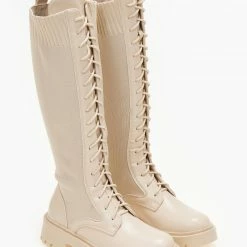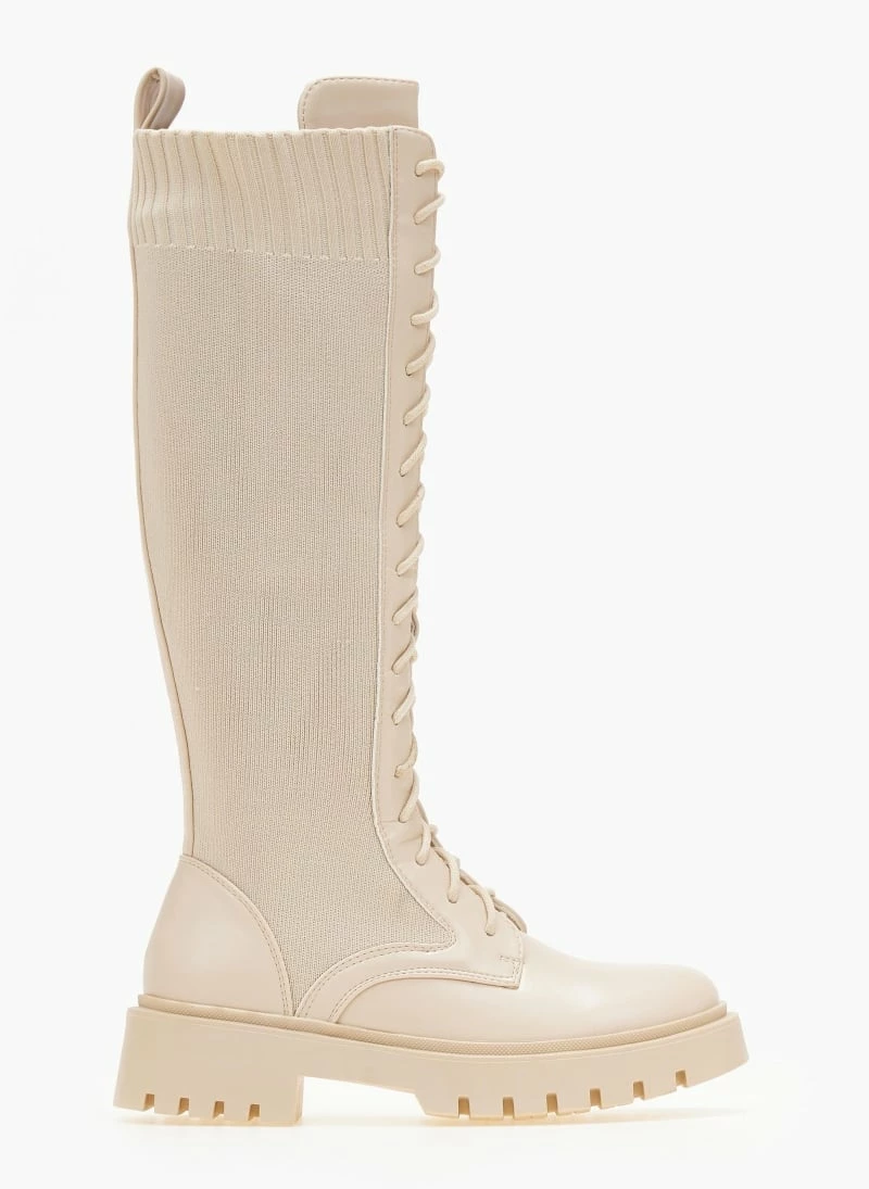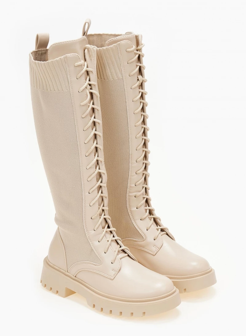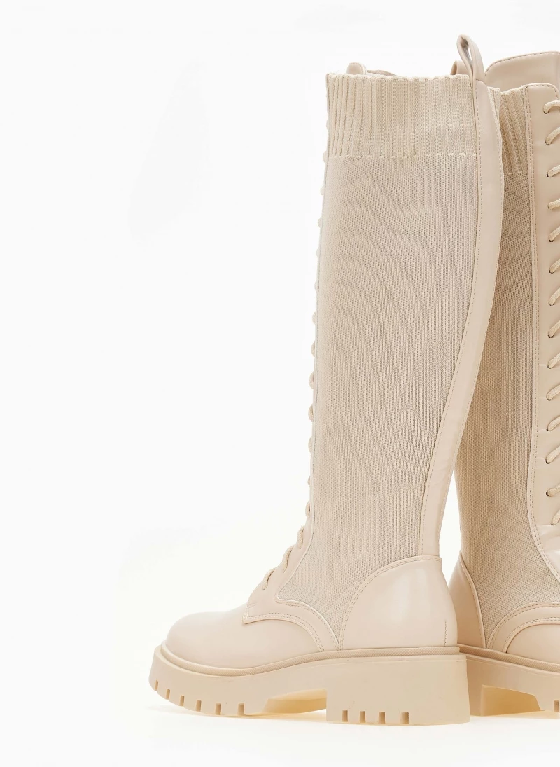 Μπότες κάλτσα με κορδόνια. Έχουν ελαστική γάμπα. Λεπτομέρεια θηλάκι στο τελείωμα. Τρακτρωτή σόλα. Στρογγυλή γραμμή.