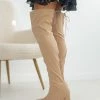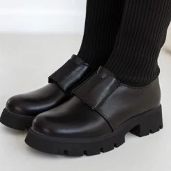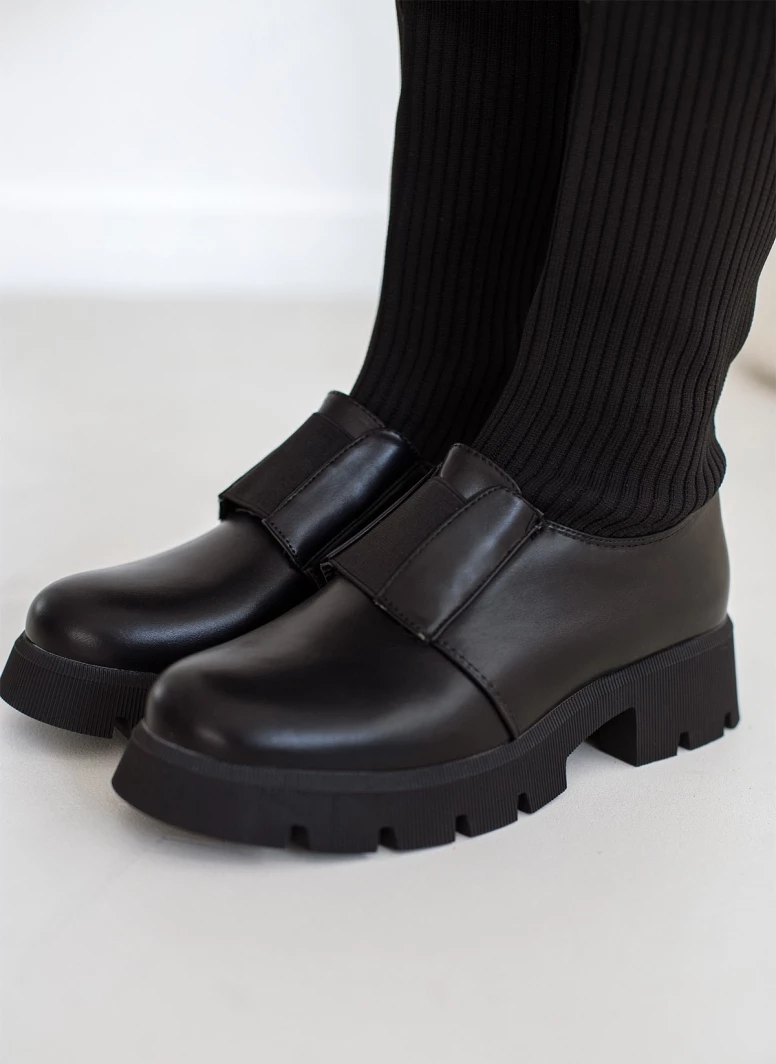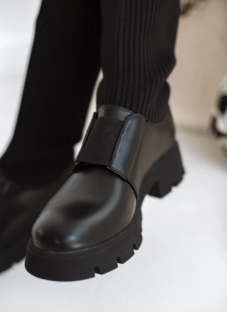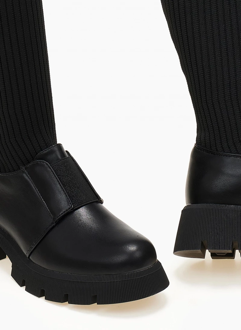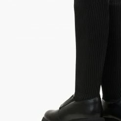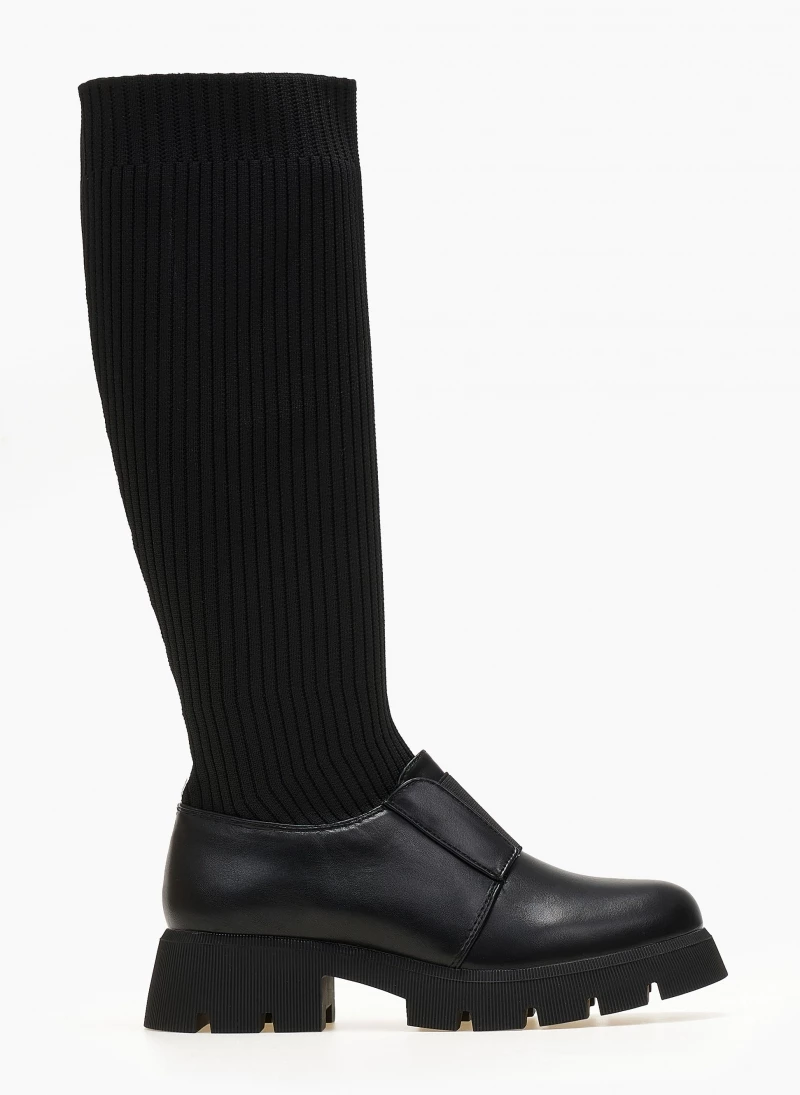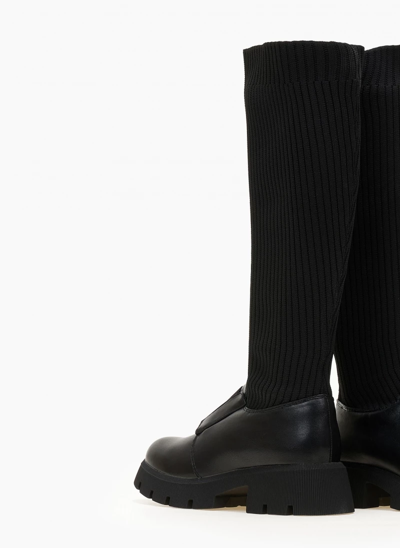 Μπότες κάλτσα από ελαστικό ύφασμα με ανάγλυφες ρίγες. Έχουν λάστιχο στο ύψος του κουτεπιέ. Ψηλή τρακτερωτή σόλα. Στρογγυλή γραμμή.