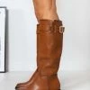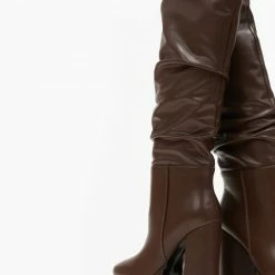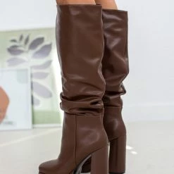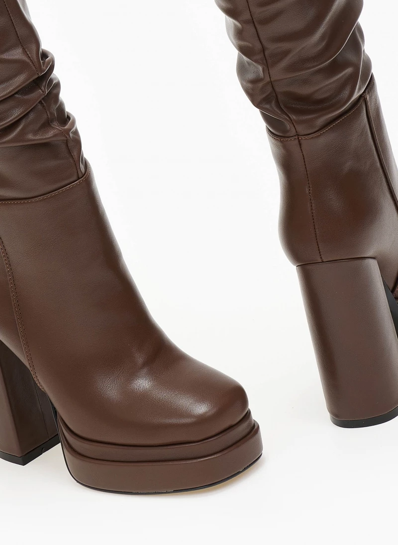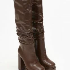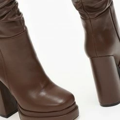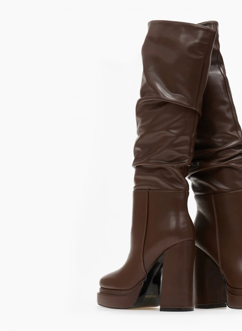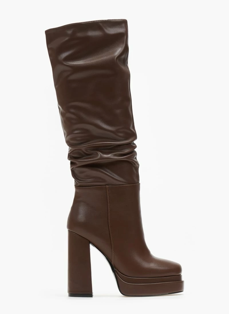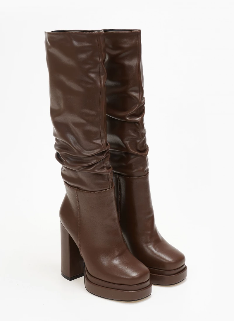 Μπότες σε καρέ γραμμή με φιάπα. Έχουν χοντρό ψηλό τακούνι. Στο ύψος της γάμπας δημιουργούνται λίγες σούρες.