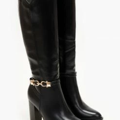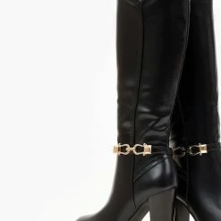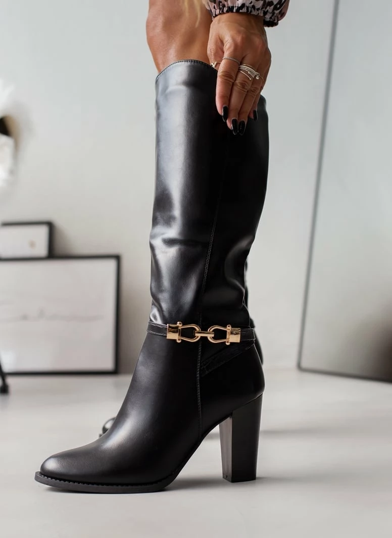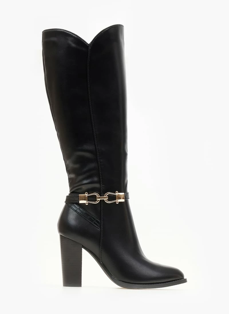 Μπότες με κροκό λουράκι στο ύψος του αστραγάλου. Έχουν μεταλλικό διακοσμητικό. Ασύμμετρο τελείωμα. Ψηλό τακούνι.