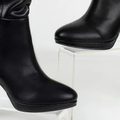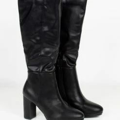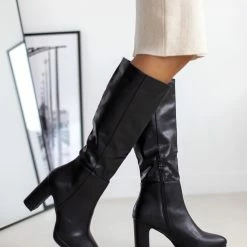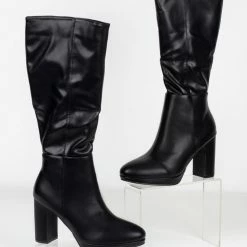 Μπότες με ψηλό τακούνι και λεπτή φιάπα. Έχουν κάθετη ραφή στο πλάι. Στρογγυλή φόρμα. Ελαστική γάμπα.