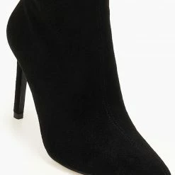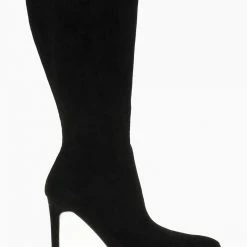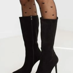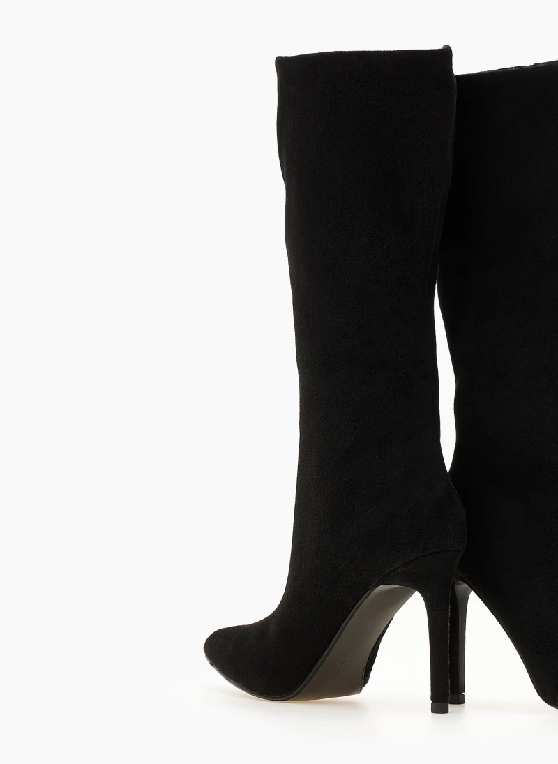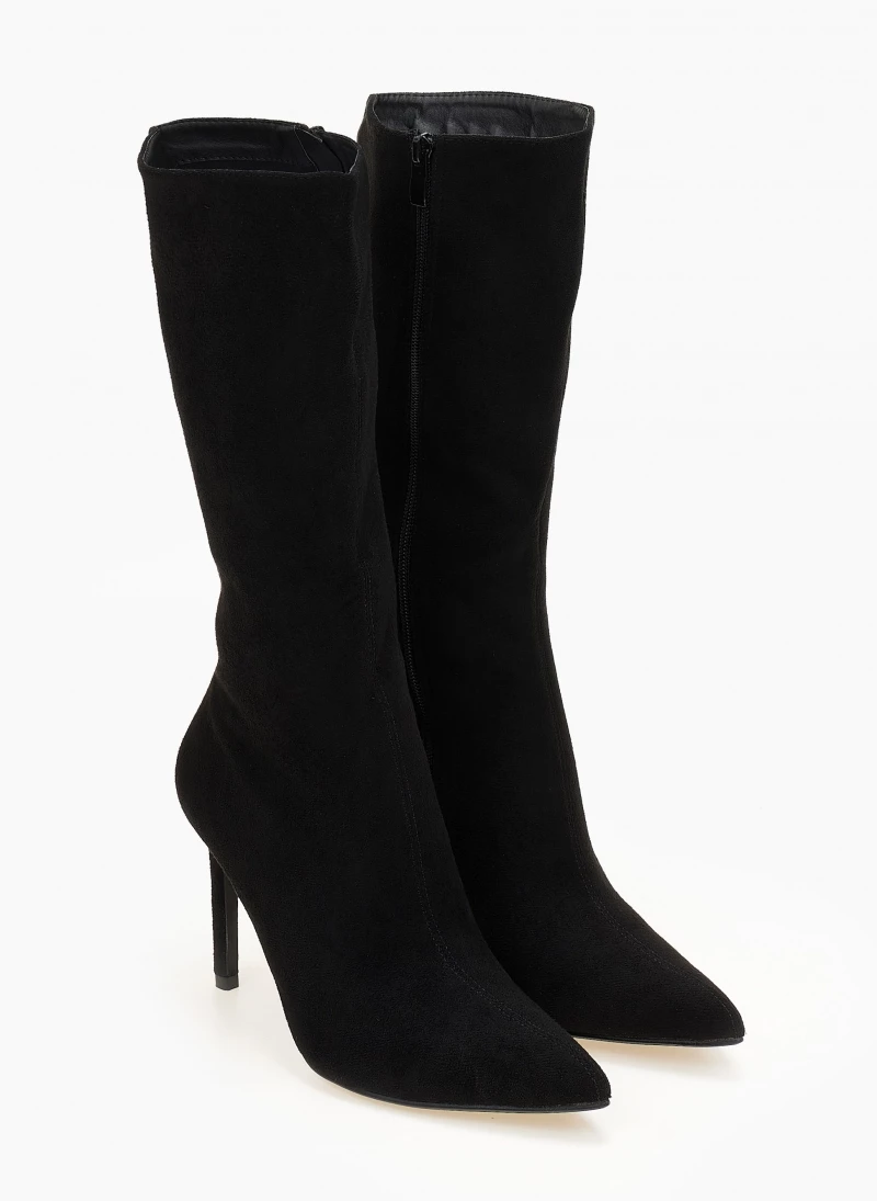 Μπότες suede με λεπτό τακούνι. Φτάνουν στη μέση της γάμπας. Μυτερή φόρμα.
