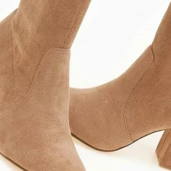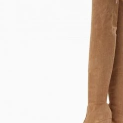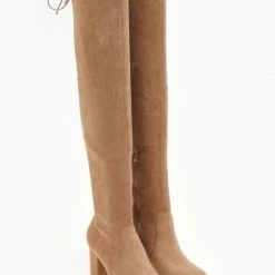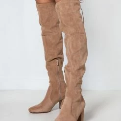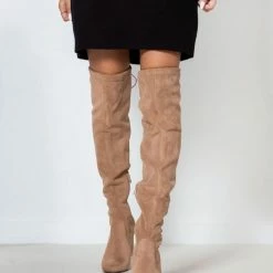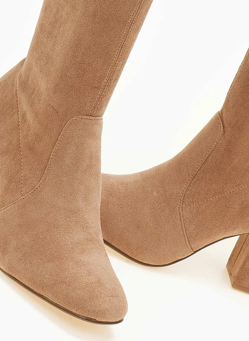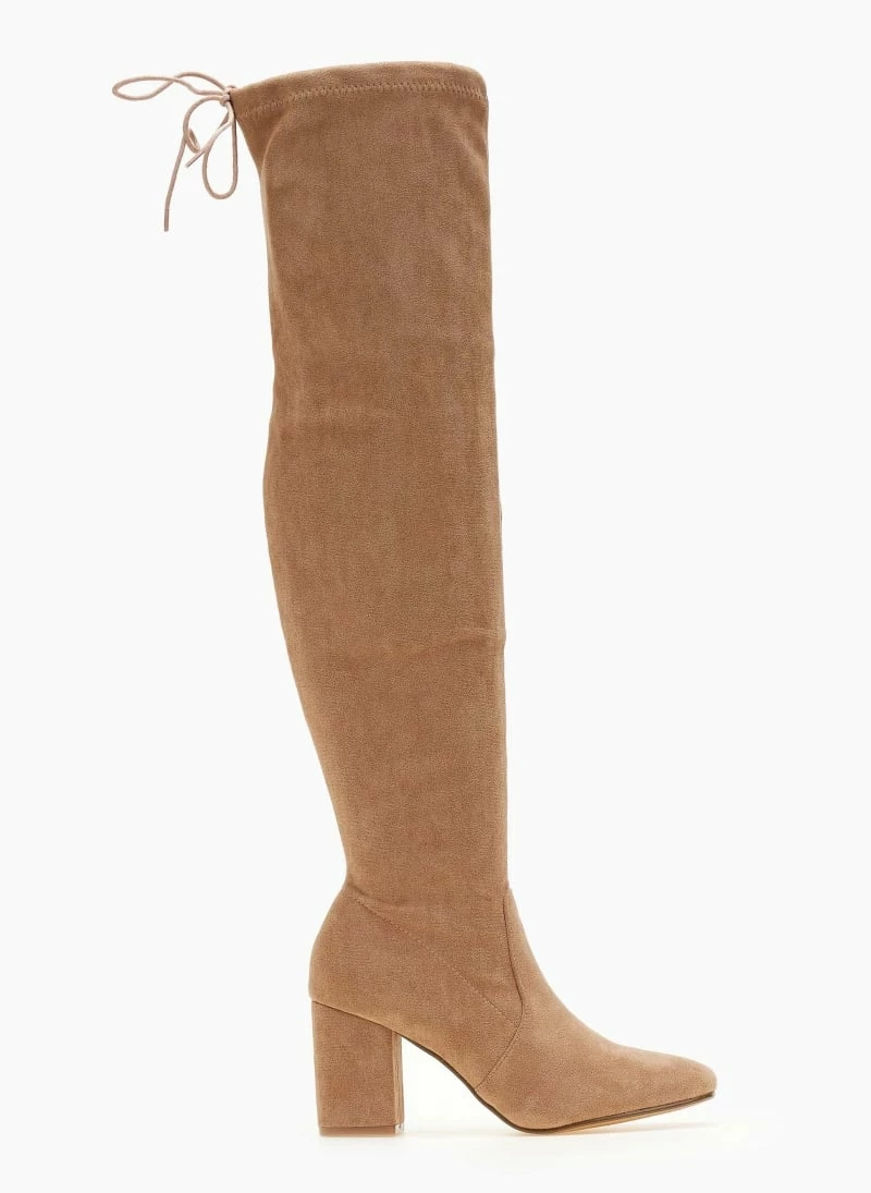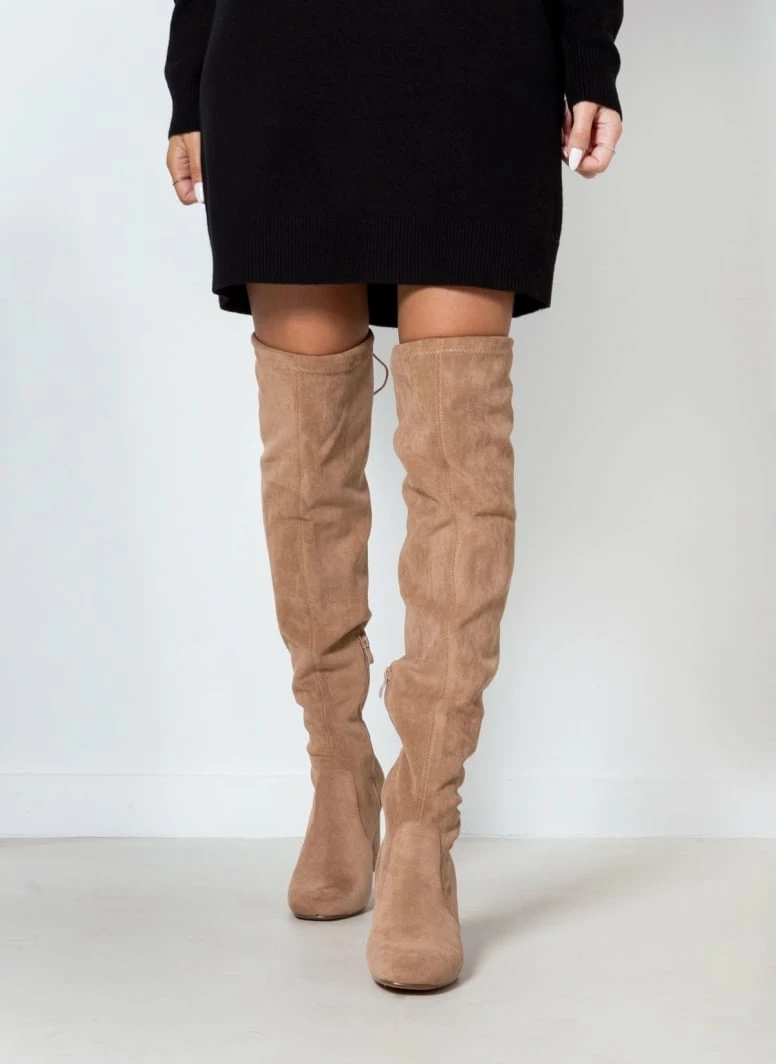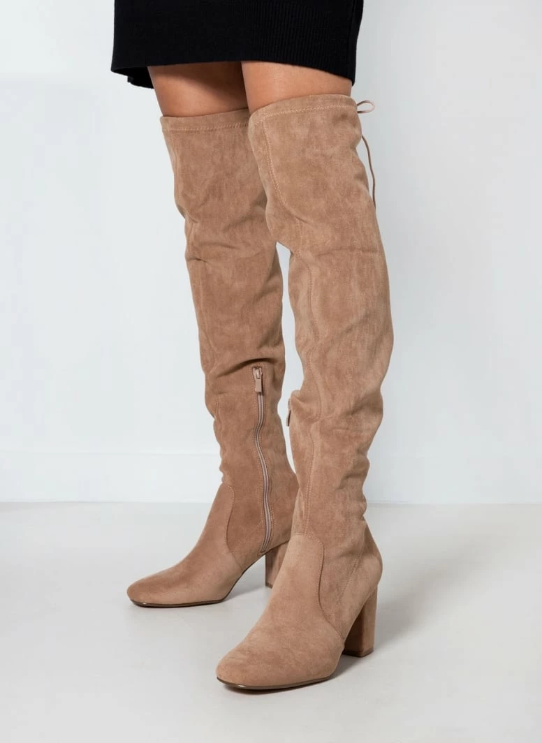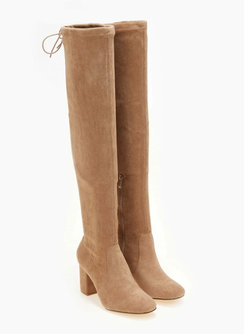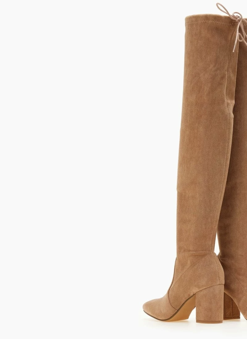 Μπότες από ελαστικό suede πάνω από το γόνατο. Έχουν χαμηλό τετράγωνο τακούνι. Κορδόνι που σφίγγει στο τελείωμα.