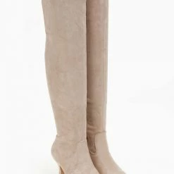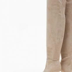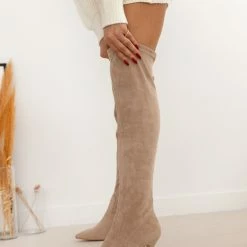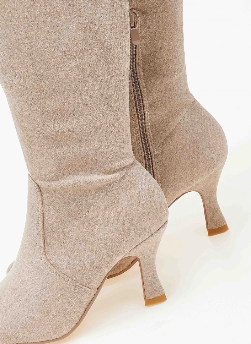 Μπότες μυτερές από suede με χαμηλό τακούνι. Είναι πάνω από το γόνατο και εσωτερικά κλείνουν με φερμουάρ.