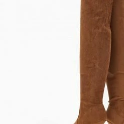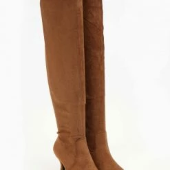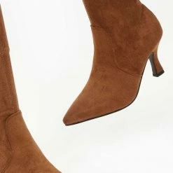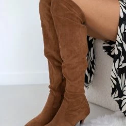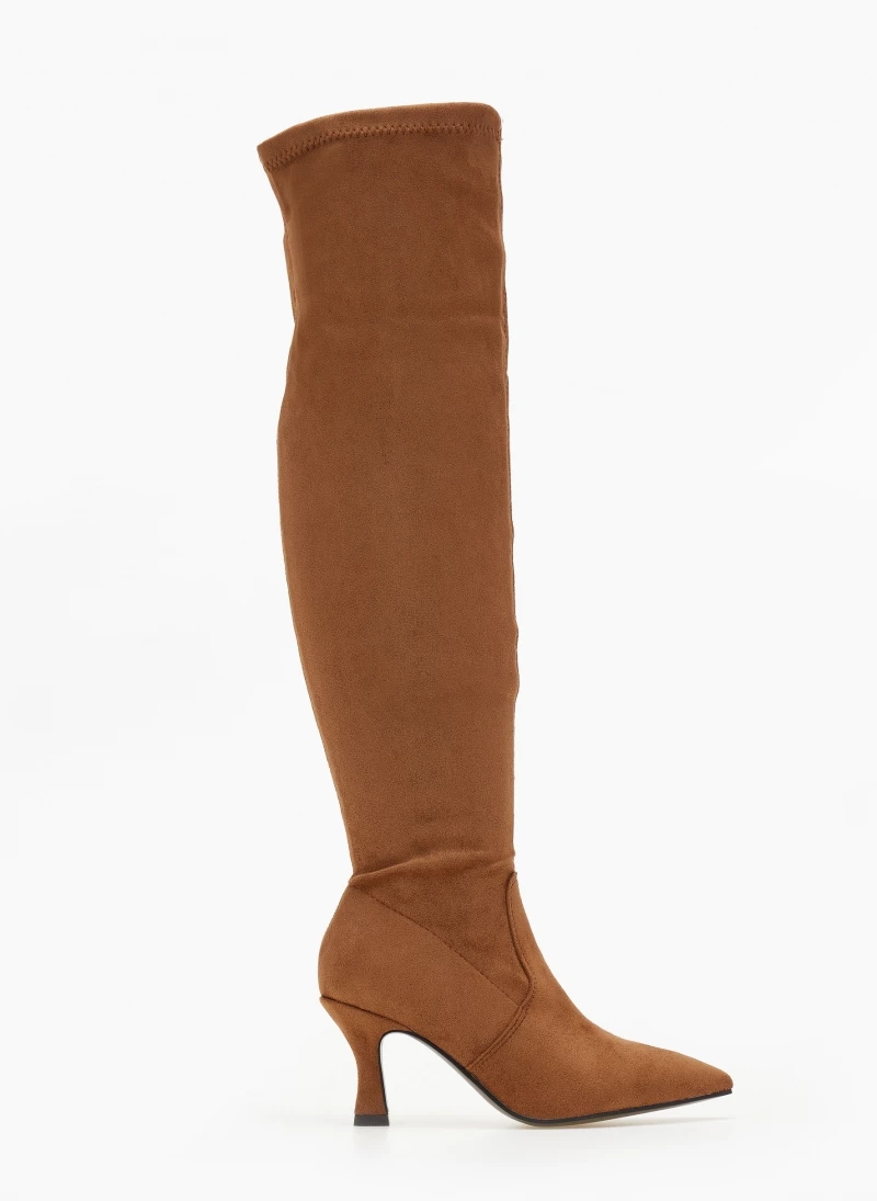 Μπότες μυτερές από suede με χαμηλό τακούνι. Είναι πάνω από το γόνατο και εσωτερικά κλείνουν με φερμουάρ.