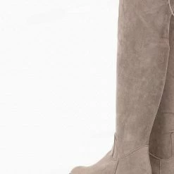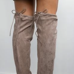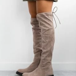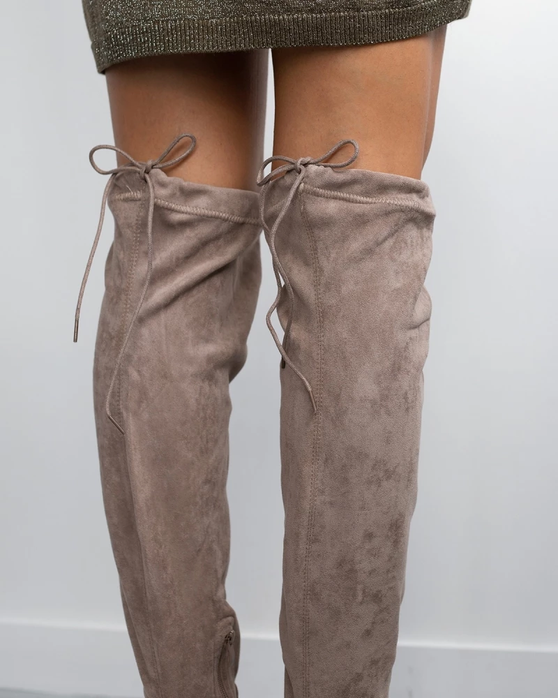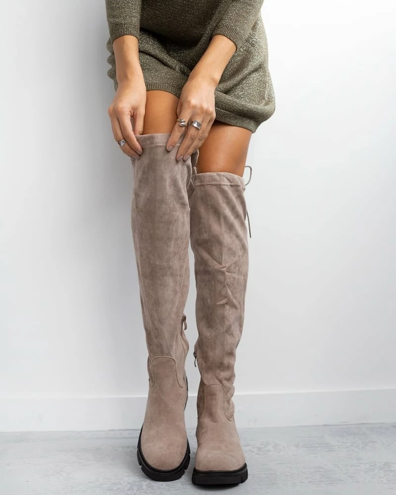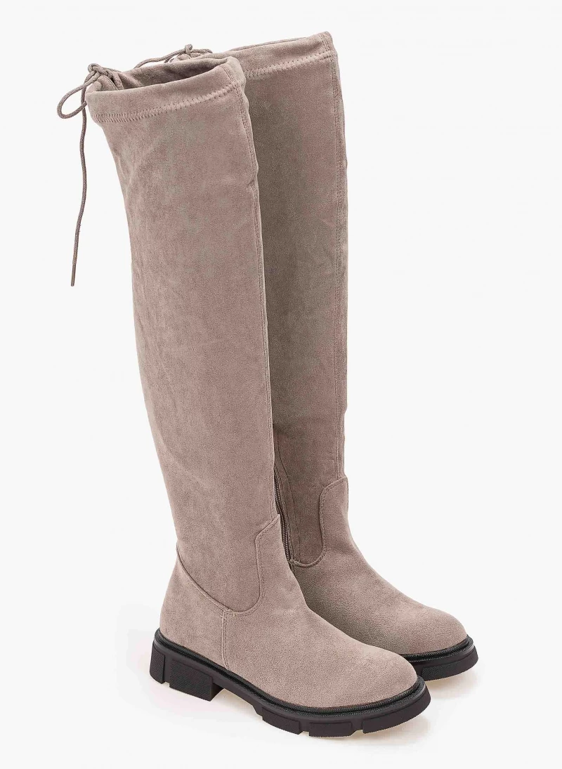 Φλατ suede μπότες πάνω από το γόνατο.Έχουν λεπτομέρεια κορδονάκι που σφίγγει στο τελείωμα.Στρογγυλή φόρμα.