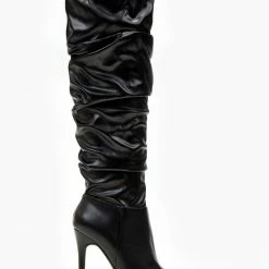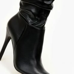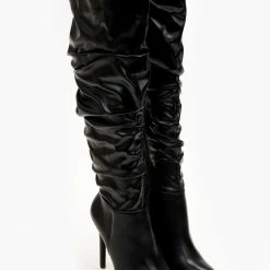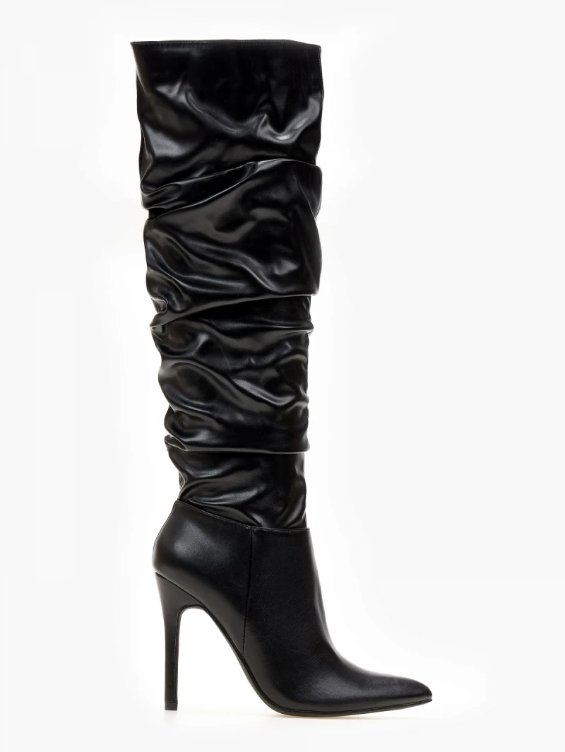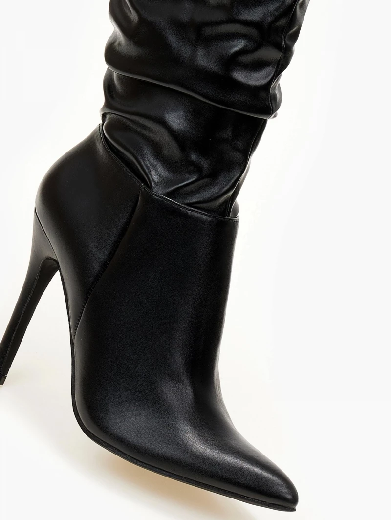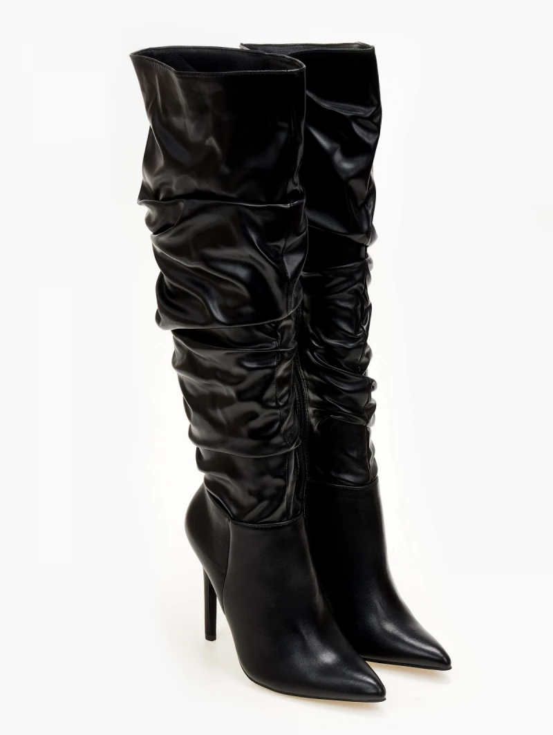 Μπότες μυτερές με λεπτό ψηλό τακούνι. Έχουν σχέδιο σούρες στη γάμπα.