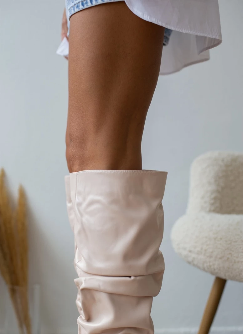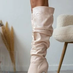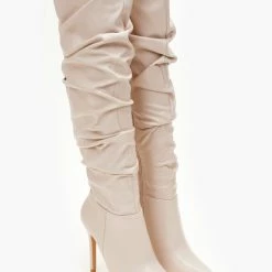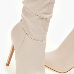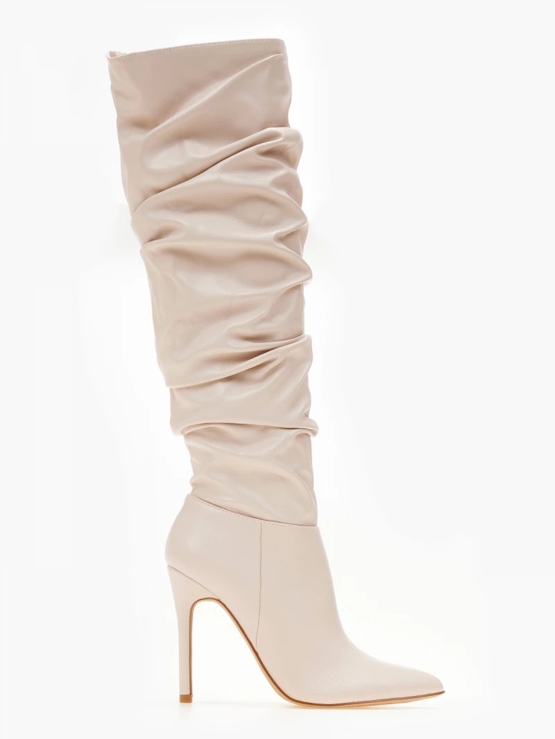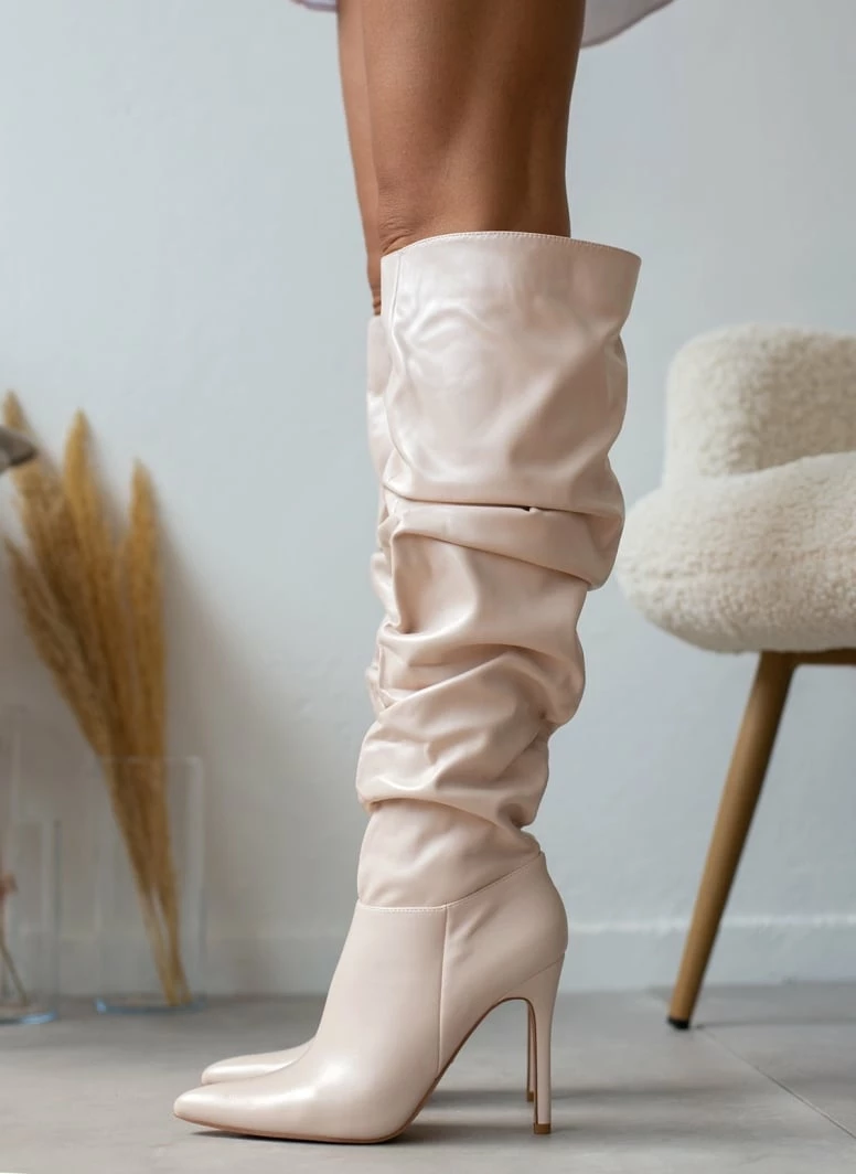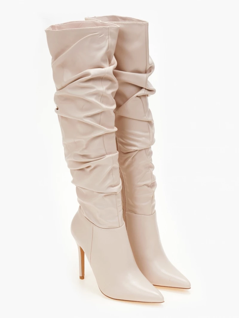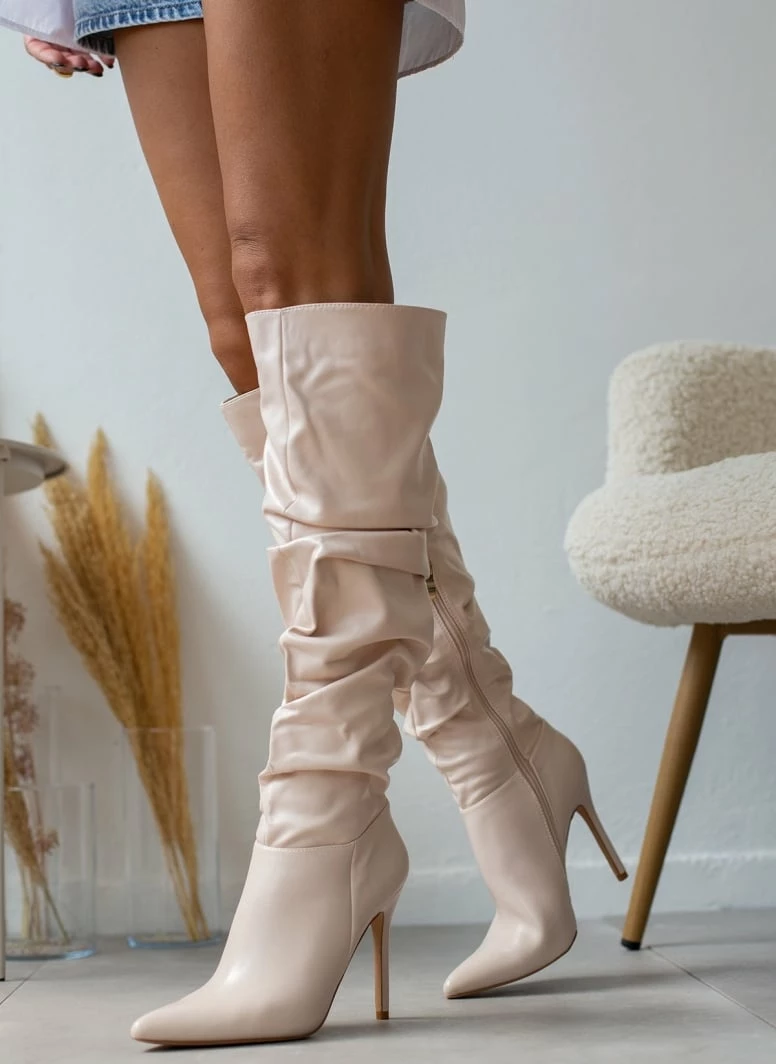 Μπότες μυτερές με λεπτό ψηλό τακούνι. Έχουν σχέδιο σούρες στη γάμπα.