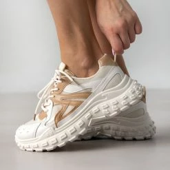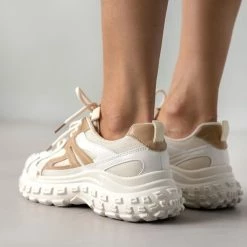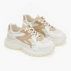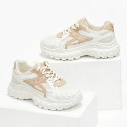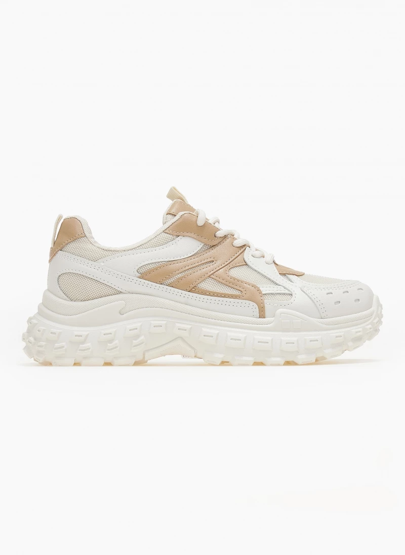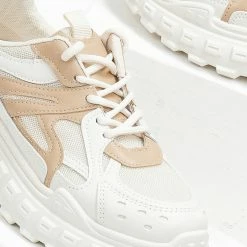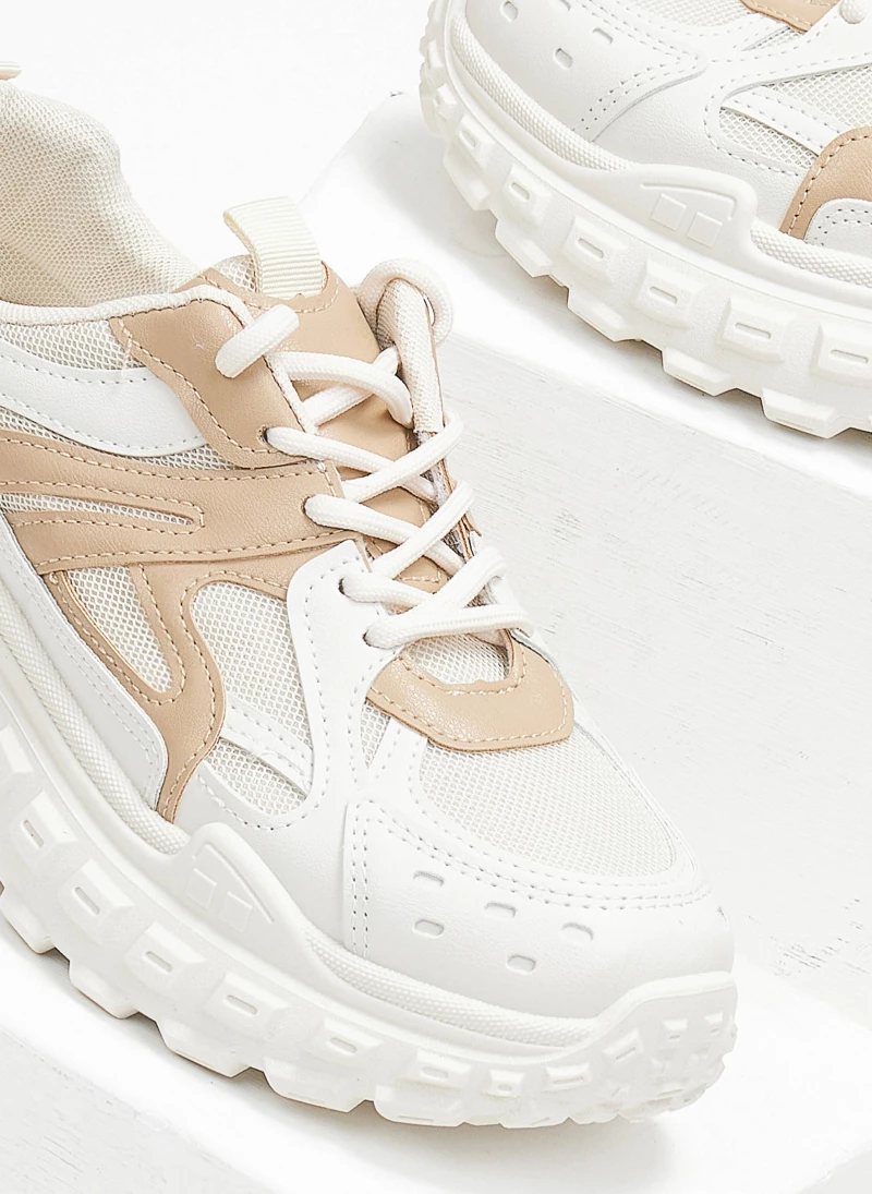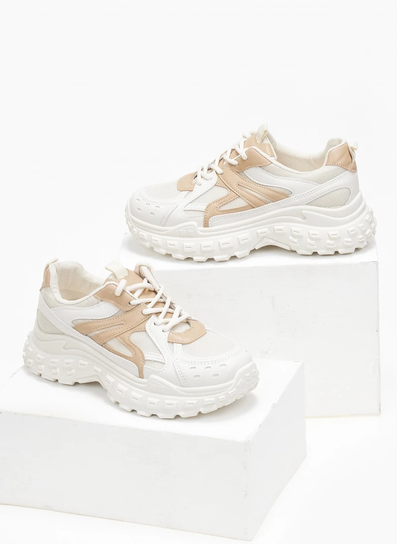 Sneakers chunky με σχέδιο στη σόλα. Συνδυάζουν ύφασμα και τεχνόδερμα.